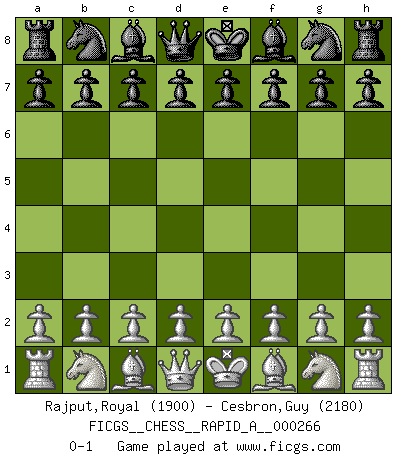 Last move : 0-1 2021 March 25 9:31:36 [Event "FICGS__CHESS__RAPID_A__000266"] [Site "FICGS"] [Date "2021.02.22"] [Round "1"] [White "Rajput,Royal"] [Black "Cesbron,Guy"] [Result "0-1"] [WhiteElo "1900"] [BlackElo "2180"] 0-1 This chess game has been lost on time (started : 2021.02.22 20:38:38) Player Black won this chess game. Follow this game move after move (download)In Chess, at least, the brave inherit the earth. (Edmar Mednis) Ein Kibitz ist einer, der deinem Gegner gute Ratschläge gibt. (Andrew Soltis) Aquellos que dicen entender al Ajedrez, no entienden nada. (Robert Hubner) Le génie consiste à savoir transgresser les règles au moment opportun. (Teichmann) The various flowers seem good to different people. (Chinese proverb)
