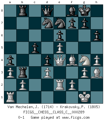 Last move : 0-1 2021 March 30 13:48:57 [Event "FICGS__CHESS__CLASS_C__000289"] [Site "FICGS"] [Date "2021.02.23"] [Round "1"] [White "Van Mechelen,Jan"] [Black "Krakovsky,Peter"] [Result "0-1"] [WhiteElo "1714"] [BlackElo "1805"] 1.Nf3 Nf6 2.g3 d5 3.Bg2 c5 4.O-O e6 5.d3 Nc6 6.Nbd2 Be7 7.e4 O-O 8.Re1 h6 9.e5 Nd7 10.Nf1 b5 11.h4 Bb7 12.N1h2 Re8 13.Bf4 Bf8 14.Ng4 b4 15.Qd2 Qe7 16.Bh3 a5 17.Re2 a4 18.a3 d4 19.R2e1 Reb8 20.Qe2 Qd8 21.Nd2 Ne7 22.Ne4 b3 23.cxb3 Bxe4 24.Qxe4 Rxb3 25.Re2 Rab8 0-1 Reti Opening Kingside Castling by player White (move 4) Kingside Castling by player Black (move 7) Player Black won this chess game. Follow this game move after move (download)The hallmark of the artist is simplicity. (Larry Evans) Den Ruhm habe ich schon, jetzt brauche ich noch das Geld. (Wilhelm Steinitz) El ganar no lo es todo... pero el perder es nada. (Mednis) On croit qu'il y a plus de mauvais joueurs que de bons joueurs, c'est faux : Il y a autant de joueurs qui gagnent que de joueurs qui perdent. (Philippe Geluck) Pretend inferiority and encourage his arrogance. (Sun Tzu)