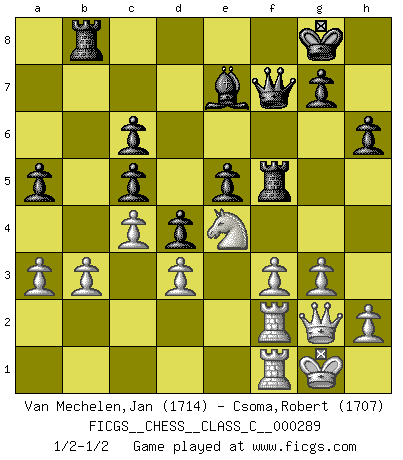Last move : 1/2-1/2 2021 March 28 12:54:3 [Event "FICGS__CHESS__CLASS_C__000289"] [Site "FICGS"] [Date "2021.02.23"] [Round "1"] [White "Van Mechelen,Jan"] [Black "Csoma,Robert"] [Result "1/2-1/2"] [WhiteElo "1714"] [BlackElo "1707"] 1.Nf3 d5 2.g3 Nf6 3.Bg2 c5 4.O-O Nc6 5.d3 e5 6.Bg5 Be7 7.Nfd2 h6 8.Bxf6 Bxf6 9.c4 Be6 10.Nc3 d4 11.Nd5 Bxd5 12.Bxd5 O-O 13.Bxc6 bxc6 14.Qa4 Qb6 15.Rab1 Qb4 16.Qc2 a5 17.a3 Qb6 18.b3 Be7 19.e4 f5 20.exf5 Rxf5 21.Ne4 Qc7 22.Qe2 Qd7 23.Qd2 Rh5 24.f3 Qh3 25.Qg2 Qd7 26.Rf2 Rb8 27.Rfb2 Rf5 28.Kh1 Rbf8 29.Rf2 Qe6 30.Kg1 Qf7 31.Rbf1 Rb8 1/2-1/2 Reti : King's Indian attack (Barcza system) Kingside Castling by player White (move 4) Kingside Castling by player Black (move 12) This chess game ended in a draw. Follow this game move after move (download)White lost because he failed to remember the right continuation and had to think up the moves himself. (Siegbert Tarrasch) Kein Schachspieler kann gut schlafen. (H. G. Wells) No hay precio que no valga la pena por la cabellera del Rey enemigo. (Koblentz) Les échecs sont un jeu terrible. Si vous n'avez pas le centre, votre adversaire a une position plus libre. Par contre, si vous avez le centre, alors vous avez vraiment quelque chose pour laquelle vous inquiéter ! (Siegbert Tarrasch) Warrior pose battles inner weakness and wins focus. You see that there is no war within you. You're on your own side, and you are your own strength. (Terri Guillemets)