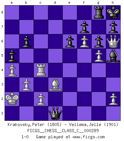 Last move : 1-0 2021 July 8 21:40:48 [Event "FICGS__CHESS__CLASS_C__000289"] [Site "FICGS"] [Date "2021.02.23"] [Round "1"] [White "Krakovsky,Peter"] [Black "Vellema,Jelle"] [Result "1-0"] [WhiteElo "1805"] [BlackElo "1901"] 1.e4 e6 2.d4 d5 3.Nc3 dxe4 4.Nxe4 Nd7 5.Nf3 Ngf6 6.Nxf6+ Nxf6 7.Bd3 c5 8.Be3 Qc7 9.Qe2 Be7 10.O-O-O O-O 11.dxc5 Bxc5 12.Bxc5 Qxc5 13.Ne5 b6 14.g4 Bb7 15.g5 Nd5 16.Qe4 g6 17.Nd7 Qe7 18.Nf6+ Nxf6 19.gxf6 Qc7 20.Qh4 Kh8 21.Rhg1 Bf3 22.Qh6 Rg8 23.Rg3 Bh5 24.Rh3 Qe5 25.f4 Qa5 26.Rg1 Rad8 27.a3 Rd5 28.Kb1 Qc5 29.Rg5 Rxg5 30.fxg5 Qg1+ 31.Ka2 Qg4 32.Rg3 Qd4 33.Rh3 Qg4 34.Re3 Qd4 35.Re4 Qd5+ 36.b3 a5 37.Rc4 Qb7 38.Rd4 Qa8 39.Rh4 Qf3 40.a4 Qd1 41.Rc4 1-0 French : Rubinstein variation Queenside Castling by player White (move 10) Kingside Castling by player Black (move 10) Player White won this chess game. Follow this game move after move (download)My style is somewhere between that of Tal and Petrosian. (Reshevsky) Alle Schachspieler sollten auch ein Hobby haben. (Savielly Grigorievitsch Tartakower) El Ajedrez es un cuento de Hadas de las 1001 metidas de pata. (Savielly Tartakower) Si je n'étais pas joueur d'échecs, je serais le meilleur dans quelque chose d'autre. (Anatoli Karpov) Ah, the Socrating method. The best way we have of teaching everything-apart from juggling chainsaws. (Gregory House, House M.D.)