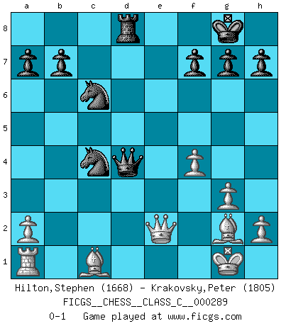 Last move : 0-1 2021 April 6 17:47:47 [Event "FICGS__CHESS__CLASS_C__000289"] [Site "FICGS"] [Date "2021.02.23"] [Round "1"] [White "Hilton,Stephen"] [Black "Krakovsky,Peter"] [Result "0-1"] [WhiteElo "1668"] [BlackElo "1805"] 1.c4 e5 2.Nc3 Nf6 3.g3 Bb4 4.Bg2 O-O 5.e4 Bxc3 6.bxc3 c6 7.Ne2 d5 8.exd5 cxd5 9.cxd5 Nxd5 10.O-O Nc6 11.Bb2 Nb6 12.d3 Bf5 13.Ba3 Re8 14.d4 Nc4 15.Bc1 Qf6 16.f4 exd4 17.cxd4 Bg4 18.Rf2 Rad8 19.Qf1 Bxe2 20.Rxe2 Rxe2 21.Qxe2 Qxd4+ 0-1 English : Bremen, Smyslov system Kingside Castling by player Black (move 4) Kingside Castling by player White (move 10) Player Black won this chess game. Follow this game move after move (download)A chess genius has died; a loss for humanity. (Viktor Kortchnoi, about Bobby Fischer's death) Die Elozahlen sind sehr schlecht für das Schach. Jetzt ist Schach eine Sportindustrie, die darauf zielt Elopunkte zu machen. (Miguel Najdorf) Yo creo que el Ajedrez posee una magia que es también una ayuda en la edad avanzada. Una rodilla reumática es olvidada durante una partida de Ajedrez y otros eventos pueden parecer algo sin importancia comparada a una catástrofe en el tablero de Ajedrez. (Vlastimil Hort) Les échecs sont utiles à l'exercice de la faculté de penser et à celle de l'imagination. Car nous devons posséder une méthode élaborée pour atteindre des buts partout où nous devons conduire notre raison. (Leibnitz) Always be a first-rate version of yourself, instead of a second-rate version of somebody else. (Judy Garland)