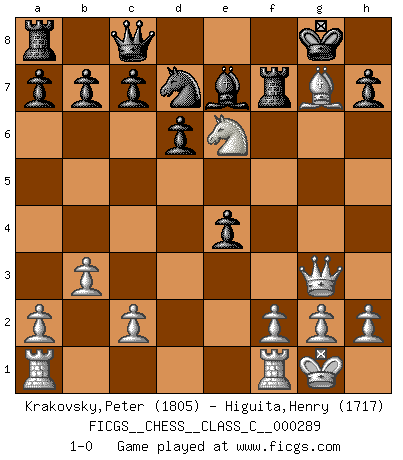 Last move : 1-0 2021 May 28 18:23:37 [Event "FICGS__CHESS__CLASS_C__000289"] [Site "FICGS"] [Date "2021.02.23"] [Round "1"] [White "Krakovsky,Peter"] [Black "Higuita,Henry"] [Result "1-0"] [WhiteElo "1805"] [BlackElo "1717"] 1.e4 e5 2.Nf3 Nc6 3.Bb5 d6 4.d4 exd4 5.Qxd4 Bd7 6.Bxc6 Bxc6 7.Nc3 Nf6 8.O-O Be7 9.b3 Nd7 10.Qe3 O-O 11.Bb2 f5 12.Nd4 Bxe4 13.Nxe4 fxe4 14.Ne6 Qc8 15.Bxg7 Rf7 16.Qg3 1-0 Ruy Lopez : Old Steinitz defense Kingside Castling by player White (move 8) Kingside Castling by player Black (move 10) Player White won this chess game. Follow this game move after move (download)The tactician knows what to do when there is something to do; whereas the strategian knows what to do when there is nothing to do. (Gerald Abrahams) Schach verlangt totale Konzentration. (Robert James Fischer) Siempre es mejor sacrificar los hombres de tu oponente. (Savielly Tartakower) Le thème de l'attaque double intervient d'une manière ou d'une autre dans l'immense majorité des combinaisons. (Youri Averbakh) It's not the will to win, but the will to prepare to win that makes the difference. (Bear Bryant)