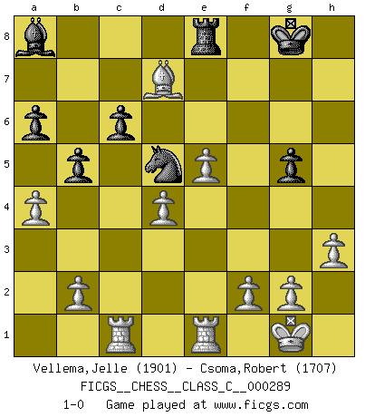 Last move : 1-0 2021 March 30 21:3:3 [Event "FICGS__CHESS__CLASS_C__000289"] [Site "FICGS"] [Date "2021.02.23"] [Round "1"] [White "Vellema,Jelle"] [Black "Csoma,Robert"] [Result "1-0"] [WhiteElo "1901"] [BlackElo "1707"] 1.d4 b5 2.e4 Bb7 3.Bd3 Nf6 4.Nd2 g6 5.Ngf3 a6 6.O-O Bg7 7.c3 O-O 8.a4 c6 9.Re1 d6 10.Nf1 Nbd7 11.h3 e5 12.Be3 exd4 13.cxd4 Re8 14.Ng3 Qc7 15.Rc1 Qd8 16.Qc2 Rc8 17.Qb3 Qe7 18.Bf4 Qf8 19.Ng5 h6 20.Bxd6 Qxd6 21.Qxf7+ Kh8 22.Qxg6 hxg5 23.Qxg7+ Kxg7 24.Nf5+ Kg8 25.Nxd6 Ba8 26.Nxc8 Rxc8 27.e5 Nd5 28.Bf5 Re8 29.Bxd7 1-0 Polish defense Kingside Castling by player White (move 6) Kingside Castling by player Black (move 7) Player White won this chess game. Follow this game move after move (download)Methodical thinking is of more use in Chess than inspiration. (C. J. S. Purdy) Der Traum, für den ich lebe, ist der von einem freien Russland. Viele mögen sagen: Russland hat doch ein Parlament, einen gewählten Präsidenten. Aber ich spüre, dass in meiner Heimat die Angst wiederkehrt. Eine Angst, sich frei zu äußern, bestimmte Dinge zu tun (Garry Kasparov) Yo jugué Ajedrez con el y a veces le pude haber ganado solo que siempre devuelve su última jugada y juega la partida de manera diferente. (Mark Twain) C'est la seule position que je connaisse où les deux camps sont mals. Propos prêtés à V. Anand. CHESS, n. f. [echecs, Fr.] A nice and abstruse game, in which two sets of puppets are moved in opposition to each other. (Dr Samuel Johnson, A Dictionary Of The English Language, 1755)