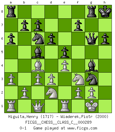 Last move : 0-1 2021 May 18 19:48:20 [Event "FICGS__CHESS__CLASS_C__000289"] [Site "FICGS"] [Date "2021.02.23"] [Round "1"] [White "Higuita,Henry"] [Black "Wiaderek,Piotr"] [Result "0-1"] [WhiteElo "1717"] [BlackElo "2000"] 1.e4 e5 2.Nf3 Nc6 3.Bc4 Bc5 4.d3 Nf6 5.a3 d6 6.h3 O-O 7.O-O a6 8.Bg5 h6 9.Bh4 g5 10.Bg3 Nh5 11.Nh2 Nxg3 12.Re1 Qf6 13.Nf3 g4 14.hxg4 Bxg4 15.Nbd2 Kh8 16.c3 Rg8 17.Qc1 Qg6 0-1 This chess game has been lost on time (started : 2021.02.23 19:14:24) Giuoco Pianissimo Kingside Castling by player Black (move 6) Kingside Castling by player White (move 7) Player Black won this chess game. Follow this game move after move (download)Tactics flow from a superior position. (Bobby Fischer) Über die Verhaftung Bobby Fischers: „Warum es die Bush-Administration für nötig befindet einen 61 Jahre alten Mann zu hetzten, der für niemanden ausser sich selbste eine Gefahr darstellt ist ein Rätsel.“ (Nigel Short) El Ajedrez es un invernadero donde los frutos del carácter pueden madurar mas completamente que en la vida. (Edward Morgan Foster) Un millionnaire : 'Monsieur Steinitz ! Vous ne participez aux tournois que pour l'argent, alors que moi je n'y viens que pour l'honneur.' Steinitz : 'Chacun joue pour ce qu'il n'a pas'... Perfection is achieved, not when there is nothing more to add, but when there is nothing left to take away. (Antoine de Saint-Exupéry)