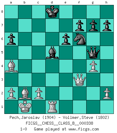 Last move : 1-0 2021 August 29 10:20:59 [Event "FICGS__CHESS__CLASS_B__000338"] [Site "FICGS"] [Date "2021.02.27"] [Round "1"] [White "Pech,Jaroslav"] [Black "Vollmer,Steve"] [Result "1-0"] [WhiteElo "1904"] [BlackElo "1802"] 1.e4 c5 2.Nf3 Nc6 3.d4 cxd4 4.Nxd4 d6 5.Nc3 Nf6 6.Bc4 e6 7.Be3 Be7 8.Qe2 Qc7 9.O-O-O a6 10.Bb3 b5 11.g4 b4 12.Nxc6 bxc3 13.Nxe7 Qxe7 14.Bd4 cxb2+ 15.Bxb2 Bb7 16.Ba4+ Kf8 17.f3 Rc8 18.Ba3 Ne8 19.e5 Qg5+ 20.Kb1 Rc3 21.Bb2 Rxf3 22.exd6 Nf6 23.d7 Ke7 24.d8Q+ Rxd8 25.Rxd8 Kxd8 26.Rd1+ Bd5 27.Qxf3 1-0 Sicilian defense Queenside Castling by player White (move 9) Promotion Queen by player White (move 24) Player White won this chess game. Follow this game move after move (download)You can only get good at Chess if you love the game. (Bobby Fischer) Computer sind die einzigen Gegner, die nicht immer eine Ausrede auf Lager haben, wenn sie gegen mich verlieren. (Robert James Fischer) Fischer es una tragedia del Ajedrez Americano a la par con Morphy y Pillsbury. (Mig Greengard) Les échecs sont un jeu terrible. Si vous n'avez pas le centre, votre adversaire a une position plus libre. Par contre, si vous avez le centre, alors vous avez vraiment quelque chose pour laquelle vous inquiéter ! (Siegbert Tarrasch) If things go wrong, don't go with them. (Roger Babson)