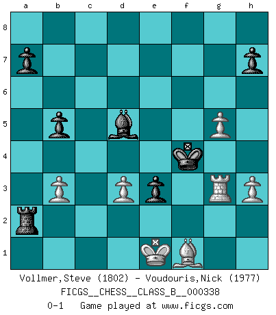 Last move : 0-1 2021 May 23 11:5:46 [Event "FICGS__CHESS__CLASS_B__000338"] [Site "FICGS"] [Date "2021.02.27"] [Round "1"] [White "Vollmer,Steve"] [Black "Voudouris,Nick"] [Result "0-1"] [WhiteElo "1802"] [BlackElo "1977"] 1.Nf3 d5 2.d4 e6 3.g3 f5 4.Bg2 Bd6 5.Nc3 c6 6.O-O Nf6 7.Bg5 O-O 8.Ne5 Qe8 9.h3 Nbd7 10.Bf4 Ne4 11.Qd3 g5 12.Nxd7 Qxd7 13.Bxd6 Nxd6 14.b3 Qg7 15.f4 gxf4 16.Rxf4 e5 17.dxe5 Qxe5 18.Raf1 Be6 19.Qd4 Qxd4+ 20.Rxd4 Ne4 21.Nxe4 fxe4 22.R4d1 Kg7 23.Rf2 Rxf2 24.Kxf2 Kf6 25.Rg1 Rf8 26.Ke3 Ke5 27.c4 d4+ 28.Kd2 Rf2 29.Ke1 e3 30.g4 b5 31.cxb5 d3 32.exd3 Rxa2 33.Bf1 cxb5 34.g5 Bd5 35.Rg3 Kf4 0-1 Reti Opening Kingside Castling by player White (move 6) Kingside Castling by player Black (move 7) Player Black won this chess game. Follow this game move after move (download)Avoid the crowd. Do your own thinking independently. Be the Chess player, not the Chess piece. (Ralph Charell) Ein Schachgenie ist jemand der verdammt gut Schach spielt. (Jonathan Levitt) Siempre es mejor sacrificar los hombres de tu oponente. (Savielly Tartakower) Demandez au pauvre Cg1 ce qu'il en pense. Eduard Gufeld à propos de la variante Saemisch de l'Est-Indienne. At work, the authority of a person is inversely proportional to the number of pens that person is carrying. (Dan Rotaru)