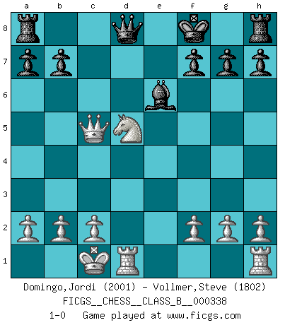 Last move : 1-0 2021 April 25 13:26:55 [Event "FICGS__CHESS__CLASS_B__000338"] [Site "FICGS"] [Date "2021.02.27"] [Round "1"] [White "Domingo,Jordi"] [Black "Vollmer,Steve"] [Result "1-0"] [WhiteElo "2001"] [BlackElo "1802"] 1.e4 c5 2.Nf3 Nc6 3.d4 cxd4 4.Nxd4 d6 5.Nc3 Nf6 6.Bg5 e6 7.Qd2 Be7 8.O-O-O d5 9.exd5 Nxd4 10.Qxd4 Nxd5 11.Bxe7 Kxe7 12.Bc4 Kf8 13.Bxd5 exd5 14.Nxd5 Be6 15.Qc5+ 1-0 Sicilian defense Queenside Castling by player White (move 8) Player White won this chess game. Follow this game move after move (download)Fischer is under obligation to nobody. (Joseph Platz) Man gibt nur Pakete auf. (Paul Keres) Nunca nadie ha ganado una partida de Ajedrez rindiendose. (Unknown) Nous vivons dans un monde échiquéen : chaque jour qui passe est un défi à relever. (Philosophe Sasha) Everybody lies. (Gregory House, House M.D.)