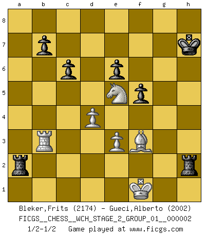 Last move : 1/2-1/2 2007 August 30 7:43:44 [Event "FICGS__CHESS__WCH_STAGE_2_GROUP_01__000002"] [Site "FICGS"] [Date "2007.07.11"] [Round "1"] [White "Bleker,Frits"] [Black "Gueci,Alberto"] [Result "1/2-1/2"] [WhiteElo "2174"] [BlackElo "2002"] 1.d4 Nf6 2.c4 e6 3.g3 Bb4+ 4.Bd2 Be7 5.Bg2 d5 6.Nf3 O-O 7.O-O c6 8.Qb3 Nbd7 9.Rc1 Ne4 10.Bb4 Bxb4 11.Qxb4 f5 12.e3 a5 13.Qb3 Qe7 14.Rc2 a4 15.Qa3 Qxa3 16.Nxa3 g5 17.Ne1 g4 18.Nd3 Ndf6 19.Rac1 Kg7 20.Nb1 h5 21.Nd2 Rh8 22.f3 Nxd2 23.Rxd2 h4 24.gxh4 Rxh4 25.Re2 Bd7 26.fxg4 Rxg4 27.Ne5 Rg5 28.h4 Rh5 29.Bf3 Rxh4 30.Rg2+ Kh7 31.Kf2 dxc4 32.Rg6 Rh2+ 33.Kg3 Rh6 34.Rxf6 Rg8+ 35.Kf2 Rxf6 36.Nxd7 Rh6 37.Rxc4 Rh2+ 38.Kf1 Rg3 39.Ne5 Rxb2 40.Rxa4 Rh3 41.Ra3 R3h2 42.Rb3 Rxa2 1/2-1/2 Catalan Opening Kingside Castling by player Black (move 6) Kingside Castling by player White (move 7) This chess game ended in a draw. Follow this game move after move (download)Chess is not like life... it has rules ! (Mark Pasternak) Capablanka war das größte Genie der Schachgeschichte! Aber denken sie nicht er habe nichts vom Schach verstanden. Er wusste nur soviel wie er wissen musste um seine Ziele zu erreichen. (Mikhail Moiseyevich Botvinik) El Ajedrez es sobre todo, ¡una pelea!. (Emanuel Lasker) Psychologiquement, tu dois avoir confiance en toi même, mais cette confiance doit être basée sur des faits. (Robert Fischer) Perhaps the current trend of many chess professionals taking up the more lucrative pastime of poker is not a wholly negative one. It may not be too late for humans to relearn how to take risks in order to innovate and thereby maintain the advanced lifestyles we enjoy. And if it takes a poker-playing supercomputer to remind us that we can't enjoy the rewards without taking the risks, so be it. (The Chess Master and the Computer, by Garry Kasparov - 2010)