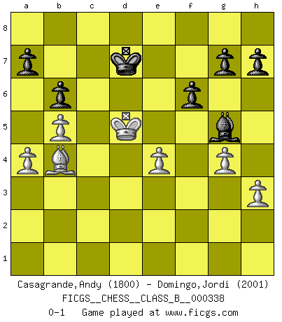 Last move : 0-1 2022 January 9 1:37:27 [Event "FICGS__CHESS__CLASS_B__000338"] [Site "FICGS"] [Date "2021.02.27"] [Round "1"] [White "Casagrande,Andy"] [Black "Domingo,Jordi"] [Result "0-1"] [WhiteElo "1800"] [BlackElo "2001"] 1.e4 e5 2.Nf3 d6 3.d4 exd4 4.Nxd4 Nf6 5.Nc3 Be7 6.g3 d5 7.e5 Ne4 8.Nxe4 dxe4 9.Bg2 Qd5 10.c3 Nc6 11.O-O Nxd4 12.Qxd4 Qxd4 13.cxd4 Bf5 14.Bd2 Rd8 15.Bc3 c5 16.dxc5 Bxc5 17.Rfe1 e3 18.fxe3 Rd7 19.Kf2 O-O 20.Rad1 Rfd8 21.Rxd7 Rxd7 22.Re2 Be6 23.a3 b6 24.Rd2 Rxd2+ 25.Bxd2 Bb3 26.Bc6 Kf8 27.Ke2 Ke7 28.Kd3 Ke6 29.Bc3 Bd5 30.Bxd5+ Kxd5 31.e4+ Kc6 32.e6 f6 33.Kc4 Bg1 34.h3 Kd6 35.e7 Kxe7 36.Kd5 Kd7 37.g4 Bf2 38.a4 Bh4 39.b4 Bf2 40.b5 Bh4 41.Bb4 Bg5 0-1 This chess game has been lost on time (started : 2021.02.27 13:34:32) Philidor : Exchange variation Kingside Castling by player White (move 11) Kingside Castling by player Black (move 19) Player Black won this chess game. Follow this game move after move (download)It is the aim of the modern school, not to treat every position according to one general law, but according to the principle inherent in the position. (Richard Reti) Alles was ich jemals tun will ist Schach spielen. (Robert James Fischer) A través de las casillas del tablero, los Indios explican el movimiento del tiempo y la edad, las influencias mas altas que controlan el mundo y los lazos que vinculan al Ajedrez con el alma humana. (Al-Masudi) L'ordinateur a tué l'originalité. Il n'y a plus guère d'aventures sur l'échiquier. (Jacob Murray) For to win one hundred victories in one hundred battles is not the acme of skill. To subdue the enemy without fighting is the acme of skill. (Sun Tzu)