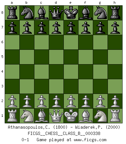 Last move : 0-1 2021 April 8 15:50:18 [Event "FICGS__CHESS__CLASS_B__000338"] [Site "FICGS"] [Date "2021.02.27"] [Round "1"] [White "Athanasopoulos,Constantinos"] [Black "Wiaderek,Piotr"] [Result "0-1"] [WhiteElo "1800"] [BlackElo "2000"] 0-1 This chess game has been lost on time (started : 2021.02.27 13:34:32) Player Black won this chess game. Follow this game move after move (download)We don't really know how the game was invented, though there are suspicions. As soon as we discover the culprits, we'll let you know. (Bruce Pandolfini) Es hat in meinem Leben Zeiten gegeben, da ich sehr nahe daran war zu glauben, daß ich auch nicht eine einzige Schachpartie verlieren könnte. (José Raúl Capablanca) Los libros de Ajedrez deben de usarse igual como usamos los anteojos: para mejorar la vista, aunque algunos jugadores los quieren usar como si ellos les otorgaran la vision. (José Raúl Capablanca) Les échecs c'est le défi de l'alpiniste, toujours plus haut, prêt à tout pour monter à l'assaut du Roi ennemi. Les échecs, c'est de la musique en mouvement, un ballet majestueux pour les yeux. C'est de la poésie composée par les fantômes du passé qui au même titre que Rimbaud ou Verlaine méritent notre admiration. Les échecs, c'est de la peinture ou le moindre mouvement modifie le tableau pour en faire un Picasso ou un Van Gogh. Les échecs, c'est tout et rien, c'est la vie et la mort. Jjulie33 sur le forum de France-Echecs. Computers have lots of memory but no imagination. (Anonymous)