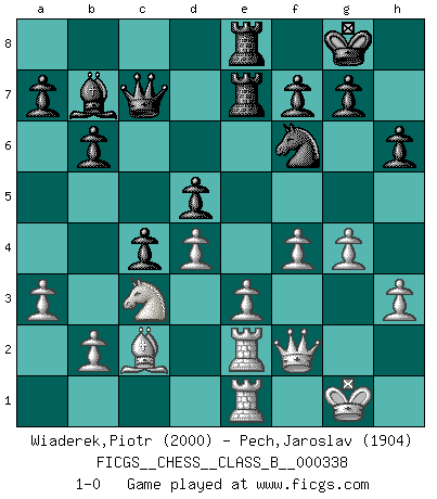 Last move : 1-0 2021 July 28 21:38:44 [Event "FICGS__CHESS__CLASS_B__000338"] [Site "FICGS"] [Date "2021.02.27"] [Round "1"] [White "Wiaderek,Piotr"] [Black "Pech,Jaroslav"] [Result "1-0"] [WhiteElo "2000"] [BlackElo "1904"] 1.d4 d5 2.c4 c6 3.Nc3 Nf6 4.Nf3 e6 5.Bg5 h6 6.Bh4 Be7 7.e3 Nbd7 8.cxd5 exd5 9.Qc2 O-O 10.Bd3 Re8 11.O-O Ne4 12.Bxe4 Bxh4 13.Bh7+ Kh8 14.Nxh4 Qxh4 15.Bd3 Qe7 16.Rfe1 Nf6 17.f3 b6 18.Qf2 Be6 19.Rad1 Rad8 20.Bc2 Kg8 21.a3 Qc7 22.h3 c5 23.Re2 Bc8 24.Red2 Bb7 25.Bb3 c4 26.Bc2 Re7 27.Re2 Rde8 28.Rde1 Nh5 29.f4 Nf6 30.g4 1-0 This chess game has been lost on time (started : 2021.02.27 13:34:32) QGD Slav defense Kingside Castling by player Black (move 9) Kingside Castling by player White (move 11) Player White won this chess game. Follow this game move after move (download)The laws of Chess do not permit a free choice: you have to move whether you like it or not. (Emanuel Lasker) Taktik ist was man tun muß, wenn etwas zu tun ist. Strategie ist was man tun muß, wenn nichts zu tun ist. (Savielly Grigorievitsch Tartakower) Solo el jugador con la iniciativa tiene el derecho a atacar. (Wilhelm Steinitz) Les sacrifices démontrent seulement que quelqu'un a gaffé. (Savielly Tartacover) A good player is always lucky. (Capablanca)
