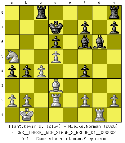 Last move : 0-1 2007 September 29 16:24:2 [Event "FICGS__CHESS__WCH_STAGE_2_GROUP_01__000002"] [Site "FICGS"] [Date "2007.07.11"] [Round "1"] [White "Plant,Kevin D."] [Black "Mielke,Norman"] [Result "0-1"] [WhiteElo "2164"] [BlackElo "2026"] 1.e4 c5 2.Nf3 Nc6 3.d4 cxd4 4.Nxd4 Nf6 5.Nc3 e5 6.Ndb5 d6 7.Bg5 a6 8.Na3 b5 9.Bxf6 gxf6 10.Nd5 Bg7 11.Qf3 f5 12.Bd3 f4 13.g3 Ne7 14.gxf4 Nxd5 15.exd5 Qf6 16.Qe4 Qxf4 17.Qxf4 exf4 18.O-O-O Bg4 19.Rd2 Bh5 20.c4 Rc8 21.Kb1 b4 22.Nc2 a5 23.Rg1 Bf6 24.Na1 Bg6 25.Nb3 a4 26.Na5 Kd7 0-1 Sicilian : Pelikan (Lasker/Sveshnikov) variation Queenside Castling by player White (move 18) Player Black won this chess game. Follow this game move after move (download)Chess is a cold bath for the mind. (Sir John Simon) Die unerbitterlichsten Regeln im Schach sind die Ausnahmen. (Savielly Grigorievitsch Tartakower) El Ajedrez es 99 por ciento táctica. (Teichmann) Botvinnik disait en comparant les échecs à la musique: Il existe une science dont le but est l'étude de l'acoustique et des sons. Mais il y a aussi un art qui se sert de l'océan des sons : c'est la musique. De toute évidence, il en est de même pour la pensée. La logique est l'étude des lois de la réflexion et les échecs reflètent, en tant qu'art, le côté logique de la réflexion, sous la forme d'images artistiques... Extrait de Fischer - Spassky, Reykjavik 1972 par Alexander & F. Wyndham (Ed. Solar), p 37. When it is a question of money, everybody is of the same religion. (Voltaire)