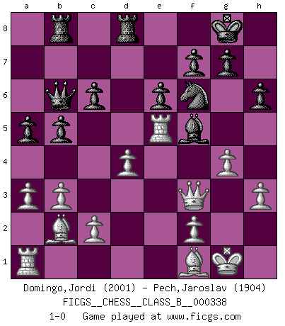 Last move : 1-0 2021 July 31 12:11:57 [Event "FICGS__CHESS__CLASS_B__000338"] [Site "FICGS"] [Date "2021.02.27"] [Round "1"] [White "Domingo,Jordi"] [Black "Pech,Jaroslav"] [Result "1-0"] [WhiteElo "2001"] [BlackElo "1904"] 1.e4 d5 2.exd5 Qxd5 3.Nc3 Qa5 4.d4 Nf6 5.Nf3 c6 6.Bc4 Bf5 7.O-O e6 8.Re1 Nbd7 9.Bf4 Bb4 10.Bd2 O-O 11.a3 Bxc3 12.Bxc3 Qc7 13.h3 Rfd8 14.b3 a5 15.Bb2 b5 16.Bf1 h6 17.Ne5 Nxe5 18.Rxe5 Rab8 19.Qf3 Qb6 20.g4 1-0 Scandinavian (centre counter) defense Kingside Castling by player White (move 7) Kingside Castling by player Black (move 10) Player White won this chess game. Follow this game move after move (download)Fischer sacrificed virtually everything most of us weakies (to use his term) value, respect, and cherish, for the sake of an artful, often beautiful board game, for the ambivalent privilege of being its greatest master. (Paul Kollar) Wie gewinnt Tal? Er entwickelt alle seine Figuren in die Brettmitte und opfert sie dann irgendwo. (Robert James Fischer) En un gambito tu regalas un Peón por el bién de tomar un juego perdido. (Samuel Standige Boden) On croit qu'il y a plus de mauvais joueurs que de bons joueurs, c'est faux : Il y a autant de joueurs qui gagnent que de joueurs qui perdent. (Philippe Geluck) If everyone is thinking alike, then somebody isn't thinking. (US General George S. Patton)