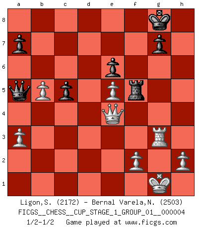 Last move : 1/2-1/2 2021 May 19 0:53:5 [Event "FICGS__CHESS__CUP_STAGE_1_GROUP_01__000004"] [Site "FICGS"] [Date "2021.03.02"] [Round "1"] [White "Ligon,Scott"] [Black "Bernal Varela,Nelson"] [Result "1/2-1/2"] [WhiteElo "2172"] [BlackElo "2503"] 1.d4 e6 2.e4 d5 3.e5 c5 4.c3 Qb6 5.Nf3 Nc6 6.a3 Nh6 7.Bd3 cxd4 8.O-O Nf5 9.b4 Be7 10.Re1 h6 11.c4 dxc4 12.Bxc4 Qc7 13.Nbd2 O-O 14.Bb2 b6 15.Rc1 Qd7 16.g4 Nh4 17.Nxh4 Bxh4 18.Nf3 Bg5 19.Nxg5 hxg5 20.Re4 Bb7 21.b5 Na5 22.Rxd4 Qe7 23.Rd7 Qe8 24.Be2 Rc8 25.R1c7 Rxc7 26.Rxc7 Bd5 27.Rc3 Nb7 28.Rh3 Nc5 29.Qc1 Qe7 30.Qe3 Be4 31.Bc1 f6 32.Bd2 f5 33.Qxg5 Qd7 34.Bb4 fxg4 35.Bxg4 Bf5 36.Qh5 Bxg4 37.Qxg4 Rf5 38.Bxc5 bxc5 39.Rg3 Qc7 40.Qe4 Qa5 1/2-1/2 Queen's pawn Kingside Castling by player White (move 8) Kingside Castling by player Black (move 13) This chess game ended in a draw. Follow this game move after move (download)Of all my Russian books, the defense contains and diffuses the greatest 'warmth' which may seem odd seeing how supremely abstract Chess is supposed to be. (Vladimir Nabokov) Die westlichen Werte sind eine Sprache, welche die Putin-Administration nicht versteht. (Garry Kasparov) Todos los jugadores de Ajedrez deberían tener un pasatiempo. (Savielly Tartakower) Mais n'est-ce pas déjà le limiter injurieusement que d'appeler les échecs un jeu? N'est-ce pas aussi une science, un art, ou quelque chose qui, comme le cercueil de Mahomet entre ciel et terre, est suspendu entre l'un et l'autre, et qui réunit un nombre incroyable de contraires ? (Stefan Zweig) When you don't know what to do, walk fast and look worried. (Anonymous)