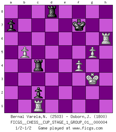 Last move : 1/2-1/2 2021 May 18 17:28:13 [Event "FICGS__CHESS__CUP_STAGE_1_GROUP_01__000004"] [Site "FICGS"] [Date "2021.03.02"] [Round "1"] [White "Bernal Varela,Nelson"] [Black "Osborn,John"] [Result "1/2-1/2"] [WhiteElo "2503"] [BlackElo "1800"] 1.e4 e5 2.Nf3 Nf6 3.Nxe5 d6 4.Nf3 Nxe4 5.d4 d5 6.Bd3 Nc6 7.O-O Be7 8.Nbd2 Bf5 9.Re1 Nxd2 10.Qxd2 Qd7 11.Bxf5 Qxf5 12.Ne5 Nd8 13.c4 dxc4 14.d5 O-O 15.Nxc4 Bf6 16.h3 Qd7 17.Ne3 c5 18.Rb1 b5 19.b4 c4 20.Ng4 Be7 21.a4 bxa4 22.Qe2 Re8 23.Bg5 h5 24.d6 hxg4 25.dxe7 Nc6 26.b5 Nd4 27.Qe4 Qf5 28.Bd2 Qxe4 29.Rxe4 Nb3 30.Bc3 gxh3 31.Rg4 f6 32.Bxf6 Kf7 33.Bc3 Rxe7 34.Rxg7+ Kf8 35.Rg3 a3 36.Rxh3 a2 37.Rd1 Rae8 38.Kh2 Kg8 39.g4 Rg7 40.Kg3 a1Q 41.Bxa1 Nxa1 42.Rxa1 c3 43.Rah1 Re4 44.Rh8+ Kf7 45.f4 Rc4 46.g5 c2 47.Rc1 Rg8 48.Rh6 Rd8 49.Rh7+ Kg6 50.Rh6+ Kf7 51.Rh7+ Kg6 52.Rh6+ Kf7 1/2-1/2 Petrov : Classical attack Kingside Castling by player White (move 7) Kingside Castling by player Black (move 14) Promotion Queen by player Black (move 40) This chess game ended in a draw. Follow this game move after move (download)I won't play with you anymore. You have insulted my friend. - When an opponent cursed himself for a blunder. (Miguel Najdorf) Ja, ich habe einmal eine Blitzpartie gespielt, es war in einem Zug, 1929. --im Interview 1989 (Mikhail Moiseyevich Botvinik) Si tu oponente te ofrece un empate, trata de averiguar porque piensa él que esta en una posición peor. (Nigel Short) Même si vous avez un bon coup à faire, regardez toujours s'il n'y en a pas un qui lui soit préférable. (Pedro Damiano) 'preceded by its own quotation yields a falsehood' preceded by its own quotation yields a falsehood. (W. V. O. Quine - Set Theory And Its Logic, 1953)