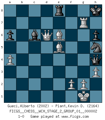 Last move : 1-0 2007 September 11 22:2:35 [Event "FICGS__CHESS__WCH_STAGE_2_GROUP_01__000002"] [Site "FICGS"] [Date "2007.07.11"] [Round "1"] [White "Gueci,Alberto"] [Black "Plant,Kevin D."] [Result "1-0"] [WhiteElo "2002"] [BlackElo "2164"] 1.e4 e5 2.Nf3 Nc6 3.Bb5 a6 4.Ba4 Nf6 5.O-O Be7 6.Re1 b5 7.Bb3 d6 8.c3 O-O 9.h3 Bb7 10.d4 Re8 11.Nbd2 Bf8 12.a4 h6 13.Bc2 exd4 14.cxd4 Nb4 15.Bb1 c5 16.d5 Nd7 17.Ra3 f5 18.Nh2 fxe4 19.Nxe4 Nxd5 20.Ng4 Kh8 21.Rg3 Qh4 22.b3 bxa4 23.bxa4 Bc6 24.Nxh6 gxh6 25.Bb2+ Re5 26.Ba2 c4 27.Bxc4 N5f6 28.Nxf6 Nxf6 29.Rxe5 dxe5 30.Bxe5 Bg7 31.Qd6 Re8 32.Be6 Nh5 33.Rxg7 1-0 Ruy Lopez : Closed Kingside Castling by player White (move 5) Kingside Castling by player Black (move 8) Player White won this chess game. Follow this game move after move (download)No Chess Grandmaster is normal; they only differ in the extent of their madness. (Viktor Korchnoi) Mein erstes Ziel war nicht, die Partie zu gewinnen, sondern eine Figur zu opfern. -- der junge (Wilhelm Steinitz) El Ajedrez es realmente noventa y nueve por ciento calculación. (Soltis) Vouloir jouer aux échecs contre soi-même est aussi paradoxal que vouloir marcher sur son ombre. (Stefan Zweig) Knowledge will give you power, but character respect. (Bruce Lee)