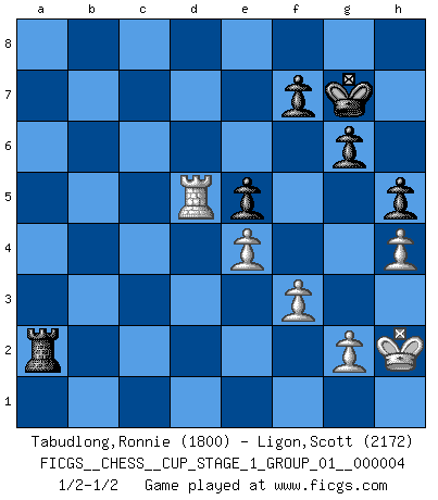 Last move : 1/2-1/2 2021 March 14 13:41:36 [Event "FICGS__CHESS__CUP_STAGE_1_GROUP_01__000004"] [Site "FICGS"] [Date "2021.03.02"] [Round "1"] [White "Tabudlong,Ronnie"] [Black "Ligon,Scott"] [Result "1/2-1/2"] [WhiteElo "1800"] [BlackElo "2172"] 1.e4 c5 2.Nf3 Nc6 3.d4 cxd4 4.Nxd4 Nf6 5.Nc3 e5 6.Ndb5 d6 7.Bg5 a6 8.Na3 b5 9.Nd5 Be7 10.Bxf6 Bxf6 11.c3 Bg5 12.Nc2 Rb8 13.a4 bxa4 14.Ncb4 Nxb4 15.cxb4 Bd7 16.Bxa6 O-O 17.O-O Bc6 18.Rxa4 Bxa4 19.Qxa4 Kh8 20.Bb5 Qc8 21.Bc6 Bd8 22.b5 Bb6 23.Nxb6 Rxb6 24.Rd1 Rd8 25.Qa7 Rxc6 26.bxc6 Qxc6 27.Qe7 Qd7 28.Qxd7 Rxd7 29.b4 g6 30.b5 Rb7 31.Rxd6 Rxb5 32.h4 Rb1+ 33.Kh2 Rb2 34.f3 h5 35.Kg3 Kg7 36.Kh2 Ra2 37.Rd5 1/2-1/2 Sicilian : Pelikan (Lasker/Sveshnikov) variation Kingside Castling by player Black (move 16) Kingside Castling by player White (move 17) This chess game ended in a draw. Follow this game move after move (download)Chess problems demand from the composer the same virtues that characterize all worthwhile art: originality, invention, conciseness, harmony, complexity, and splendid insincerity. (Vladimir Nabokov) Fallen sollten polizeilich verboten werden. (Savielly Grigorievitsch Tartakower) Mi estilo es algo parecido entre un poco de Tal y Petrosian. (Reshevsky) Ne tendez aucun piège pour le plaisir ! Ne jouez rien dans l'espoir que l'adversaire réagisse de façon stupide ! Prenez toujours pour acquis que l'adversaire va trouver le meilleur coup ! Ne jouez jamais de coup dans l'espoir que l'adversaire ne voie pas la menace ! Chacun de vos coups doit améliorer la position d'une façon ou d'une autre. Beta. Software undergoes beta testing shortly before it's released. Beta is latin for still doesn't work. (Anonymous)
