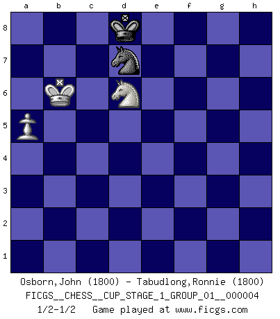 Last move : 1/2-1/2 2021 March 12 13:49:16 [Event "FICGS__CHESS__CUP_STAGE_1_GROUP_01__000004"] [Site "FICGS"] [Date "2021.03.02"] [Round "1"] [White "Osborn,John"] [Black "Tabudlong,Ronnie"] [Result "1/2-1/2"] [WhiteElo "1800"] [BlackElo "1800"] 1.e4 c5 2.Nf3 d6 3.d4 cxd4 4.Nxd4 Nf6 5.Nc3 a6 6.Be2 e5 7.Nb3 Be7 8.Be3 Nc6 9.O-O O-O 10.f3 a5 11.Na4 Be6 12.c3 Nd7 13.Bb5 f5 14.Nd2 f4 15.Bf2 Kh8 16.Nc4 Rf6 17.Nab6 Nxb6 18.Nxb6 Rb8 19.Bc4 Bxc4 20.Nxc4 b5 21.Nd2 a4 22.c4 Qa5 23.cxb5 Qxb5 24.b3 R6f8 25.bxa4 Qa6 26.Rc1 Nb4 27.Rb1 h6 28.a3 Nd3 29.Qe2 Rfc8 30.Rfd1 Ra8 31.Bb6 Rc3 32.a5 Rac8 33.Nb3 Qc4 34.Nd2 Qa2 35.Kh1 Bd8 36.h3 Qc2 37.Bxd8 Rxd8 38.Kh2 Kh7 39.Qf1 Nb2 40.Rbc1 Qd3 41.Rxc3 Qxc3 42.Nb1 Qxa5 43.Rc1 Rb8 44.Rc2 Qa7 45.Qc1 Qd4 46.Nd2 Nd3 47.Qg1 Rb2 48.Qxd4 exd4 49.Rxb2 Nxb2 50.Kg1 Kg6 51.Kf2 Kg5 52.g3 fxg3+ 53.Kxg3 Kf6 54.f4 g5 55.Nf3 d3 56.Nd2 gxf4+ 57.Kxf4 Ke6 58.Ke3 d5 59.Kd4 dxe4 60.Kxe4 h5 61.h4 Kf6 62.Kf4 Kf7 63.Kg5 Na4 64.Kxh5 Nc5 65.Kg5 Kg7 66.Kf4 Kg6 67.Ke5 Kh5 68.Kd4 Nd7 69.Kxd3 Kxh4 70.Kc4 Kg5 71.Kd5 Kf6 72.Nc4 Ke7 73.Kc6 Kd8 74.a4 Kc8 75.Nd6+ Kd8 76.a5 Ne5+ 77.Kb6 Nd7+ 78.Kb7 Nc5+ 79.Kb6 Nd7+ 80.Kb7 Nc5+ 81.Kb6 Nd7+ 1/2-1/2 Sicilian : Najdorf, Opovcensky variation Kingside Castling by player White (move 9) Kingside Castling by player Black (move 9) 10 pieces endgame at move 57 : White KNPPP , Black KNPPP WHITE : King + 1 Knight 3 Pawns BLACK : King + 1 Knight 3 Pawns 9 pieces endgame at move 59 : White KNPP , Black KNPPP WHITE : King + 1 Knight 2 Pawns BLACK : King + 1 Knight 3 Pawns 8 pieces endgame at move 60 : White KNPP , Black KNPP WHITE : King + 1 Knight 2 Pawns BLACK : King + 1 Knight 2 Pawns 7 pieces endgame at move 64 : White KNPP , Black KNP WHITE : King + 1 Knight 2 Pawns BLACK : King + 1 Knight 1 Pawn 6 pieces endgame at move 69 : White KNPP , Black KN WHITE : King + 1 Knight 2 Pawns BLACK : King + 1 Knight 5 pieces endgame at move 69 : White KNP , Black KN WHITE : King + 1 Knight 1 Pawn BLACK : King + 1 Knight This chess game ended in a draw. Follow this game move after move (download)Chess is not like life... it has rules ! (Mark Pasternak) Ein typischer, sehr verbreiteter Gedankenschädling ist der, daß der betreffende Amateur von der Annanhme ausgeht, daß jeder einzelne Zug etwas zu leisten habe. (Aaron Nimzowitsch) El ganador de una partida es aquel jugador que hace el penúltimo error. (Savielly Tartakover) Le système Elo représente seulement une moyenne. Il est simplement un indicateur de votre stabilité. (Anatoli Karpov) Philosophers use a language that is already deformed as though by shoes that are too tight. (Ludwig Wittgenstein)