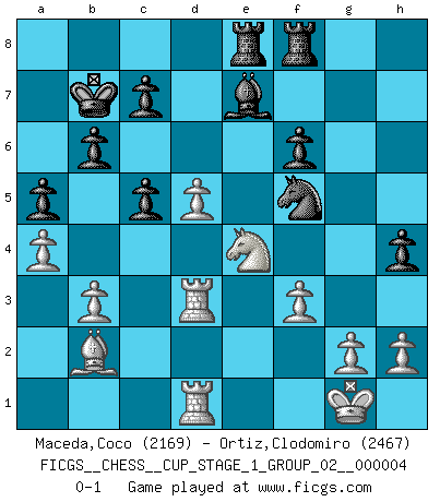 Last move : 0-1 2021 May 3 2:34:2 [Event "FICGS__CHESS__CUP_STAGE_1_GROUP_02__000004"] [Site "FICGS"] [Date "2021.03.02"] [Round "1"] [White "Maceda,Coco"] [Black "Ortiz,Clodomiro"] [Result "0-1"] [WhiteElo "2169"] [BlackElo "2467"] 1.e4 e5 2.Nf3 Nc6 3.Bb5 Nf6 4.O-O Nxe4 5.d4 Nd6 6.Bxc6 dxc6 7.dxe5 Nf5 8.Qxd8+ Kxd8 9.Nc3 Bd7 10.a4 a5 11.Rd1 Kc8 12.Ng5 Be8 13.b3 Be7 14.Nge4 b6 15.Rd3 Kb7 16.Bb2 h5 17.Rad1 Rf8 18.Ne2 c5 19.c4 Bc6 20.f3 h4 21.N2c3 f6 22.exf6 gxf6 23.Nd5 Bxd5 24.cxd5 Rae8 0-1 This chess game has been lost on time (started : 2021.03.02 1:15:17) Ruy Lopez : Berlin defense, Open variation Kingside Castling by player White (move 4) Player Black won this chess game. Follow this game move after move (download)Chess is a more highly symbolic game, but the aggressions are therefore even more frankly represented in the play. It probably began as a war game; that is, the representation of a miniature battle between the forces of two kingdoms. (Karl Meninger) Früher wurde jeder komplizierte Zug, jedes interessante Opfer mit großem Beifall und Enthusiasmus aufgenommen. Heute schaltet man einfach seinen Fritz an, und man kann sehen, was los ist, ob der Zug geht oder nicht. (Vladimir Kramnik) Bobby es el jugador de Ajedrez mas fino que este país jamás haya producido. Su memoria para las movidas, su brillantez en soñar combinaciones y su feróz determinación por la victoria son algo extraño. (John Collins) C'est la seule position que je connaisse où les deux camps sont mals. Propos prêtés à V. Anand. May I never be complete. May I never be content. May I never be perfect. Deliver me, Tyler, from being perfect and complete. (Chuck Palahniuk, Fight Club)