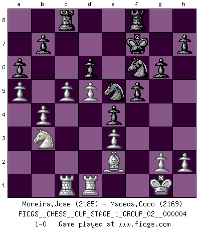 Last move : 1-0 2021 May 3 14:43:36 [Event "FICGS__CHESS__CUP_STAGE_1_GROUP_02__000004"] [Site "FICGS"] [Date "2021.03.02"] [Round "1"] [White "Moreira,Jose"] [Black "Maceda,Coco"] [Result "1-0"] [WhiteElo "2185"] [BlackElo "2169"] 1.e4 c5 2.Nf3 d6 3.d4 cxd4 4.Nxd4 Nf6 5.Nc3 a6 6.Be3 e5 7.Nb3 Be6 8.Be2 Be7 9.Qd3 O-O 10.O-O Nbd7 11.Nd5 Bxd5 12.exd5 Rc8 13.c4 Ne8 14.a4 f5 15.a5 g6 16.Rfd1 Bf6 17.Rac1 Bg5 18.Bxg5 Qxg5 19.Nd2 e4 20.Qe3 Qxe3 21.fxe3 Nef6 22.b4 Ne5 23.Nb3 Neg4 24.Rc3 Ne5 25.c5 Kf7 26.R3c1 1-0 This chess game has been lost on time (started : 2021.03.02 1:15:17) Sicilian : Najdorf, Byrne (English) attack Kingside Castling by player Black (move 9) Kingside Castling by player White (move 10) Player White won this chess game. Follow this game move after move (download)Even the laziest King flees wildly in the face of a double check ! (Aaron Nimzowitsch) Strategie ist, wie man ein Mädchen auf den Rücksitz bekommt. Taktik ist, was man tut, wenn man dann dort ist. (Anonymous) Un buen jugador siempre tiene buena suerte. (José Raúl Capablanca) Ce n'est pas pour s'amuser qu'il joue aux échecs : il célèbre un culte. (Vladimir Nabokov) Fame, I have already. Now I need the money. (an elderly Steinitz)