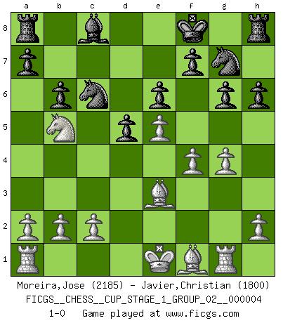 Last move : 1-0 2021 April 22 9:25:28 [Event "FICGS__CHESS__CUP_STAGE_1_GROUP_02__000004"] [Site "FICGS"] [Date "2021.03.02"] [Round "1"] [White "Moreira,Jose"] [Black "Javier,Christian"] [Result "1-0"] [WhiteElo "2185"] [BlackElo "1800"] 1.e4 c5 2.Nf3 e6 3.d4 cxd4 4.Nxd4 Nc6 5.Nc3 h6 6.Ndb5 Nf6 7.Nd6+ Bxd6 8.Qxd6 Qe7 9.Qg3 d5 10.e5 Nh5 11.Qh3 g6 12.Nb5 Qb4+ 13.Bd2 Qe4+ 14.Qe3 Qxe3+ 15.Bxe3 Kf8 16.f4 b6 17.g4 Ng7 18.Rg1 1-0 This chess game has been lost on time (started : 2021.03.02 1:15:17) Sicilian : Taimanov variation Player White won this chess game. Follow this game move after move (download)When you absolutely don't know what to do anymore, it is time to panic. (John van der Wiel) Versuche, dich von der Sklaverei der Eröffnungsvarianten zu befreien. Stattdessen soll man gewisse Typenpositionen erlernen, die man eingehend analysiert. (Aaron Nimzowitsch) El jugador táctico sabe que hacer cuando hay algo que hacer; mientras que el estratega sabe que hacer cuando no hay nada que hacer. (Gerald Abrahams) Mais l'homme est une créature légère et illogique : semblable au joueur d'échecs, il n'aime que le processus du but à atteindre, non le but lui-même. (Dostoïevsky) Luck is the residue of design. (John Milton)