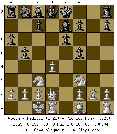 Last move : 1-0 2021 April 26 23:13:23 [Event "FICGS__CHESS__CUP_STAGE_1_GROUP_03__000004"] [Site "FICGS"] [Date "2021.03.02"] [Round "1"] [White "Wosch,Arkadiusz"] [Black "Pechova,Hana"] [Result "1-0"] [WhiteElo "2428"] [BlackElo "1821"] 1.e4 e6 2.d4 d5 3.Nc3 Nf6 4.Bg5 dxe4 5.Nxe4 Be7 6.Bxf6 gxf6 7.Nf3 f5 8.Nc3 a6 9.Qd2 b5 10.O-O-O 1-0 This chess game has been lost on time (started : 2021.03.02 1:15:20) French : Burn variation Queenside Castling by player White (move 10) Player White won this chess game. Follow this game move after move (download)There must have been a time when men were demigods, or they could not have invented Chess. (Gustav Schenk) Spiel ein langweiliges Spiel zu Ende und lustige Dinge können passieren. (Hans Ree) Si yo gano un torneo, yo lo gano por mí mismo. Yo hago las jugadas. Nadie me ayuda. (Bobby Fischer) Que feriez-vous si vous étiez en train de jouer aux échecs et que la fin du monde arrive ? Je continuerais à jouer. (Saint Borromée) The best teachers teach from the heart, not from the book. (Author unknown)