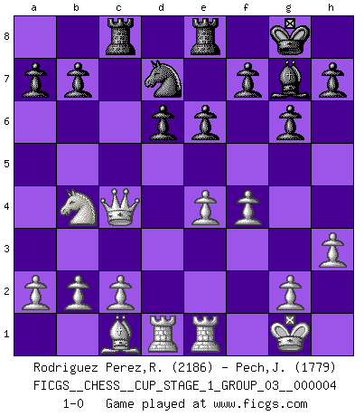 Last move : 1-0 2021 June 20 4:54:58 [Event "FICGS__CHESS__CUP_STAGE_1_GROUP_03__000004"] [Site "FICGS"] [Date "2021.03.02"] [Round "1"] [White "Rodriguez Perez,Rene"] [Black "Pech,Jaroslav senior"] [Result "1-0"] [WhiteElo "2186"] [BlackElo "1779"] 1.e4 c5 2.Nf3 d6 3.d4 cxd4 4.Qxd4 Nc6 5.Bb5 Bd7 6.Bxc6 Bxc6 7.Nc3 Nf6 8.Be3 g6 9.O-O Bg7 10.Qd3 O-O 11.Rad1 Qa5 12.h3 Rfc8 13.Nd4 Qb4 14.Bd2 Qb6 15.Nxc6 Qxc6 16.Rfe1 Re8 17.Bc1 Rac8 18.Re2 Nd7 19.Nd5 Ne5 20.Qb3 Qa6 21.R2e1 e6 22.Nb4 Qc4 23.f4 Nd7 24.Qxc4 1-0 Sicilian, Chekhover variation Kingside Castling by player White (move 9) Kingside Castling by player Black (move 10) Player White won this chess game. Follow this game move after move (download)If cunning alone were needed to excel, women would be the best Chess players. (Albin) Fischer: 'Remis!?' Uhlmann: 'Aber es muss doch dreimal Zugwiederholung sein!' Fischer: 'Sie nehmen das Remis an, wie ich es sage, sonst spiele ich weiter und werde Sie dann schlagen!' (Robert James Fischer) Aunque la mayoría de la gente disfruta observar las partidas de los grandes Maestros de ataque, algunos de los jugadores mas notables en la historia han sido los jugadores silenciosos posicionales. Lentamente ellos te aplastan despojandote de tu espacio, congestionando tus piezas y dejandote virtualmente sin nada que hacer. (Yasser Seirawan) Assurément je connaissais par expérience le mystérieux attrait de ce jeu royal, le seul entre tous les jeux inventés par les hommes qui échappe souverainement à la tyrannie du hasard, le seul où l'on ne doive sa victoire qu'à son intelligence ou plutôt à une certaine forme d'intelligence. Mais n'est-ce pas déjà le limiter injurieusement que d'appeler les échecs un jeu ? N'est-ce pas une science, un art ou quelque chose qui, comme le cercueil de Mahomet entre ciel et terre, est suspendu entre l'un et l'autre, et qui réunit un nombre incroyable de contraires ? [...] C'est une pensée qui ne mène à rien, une mathématique qui n'établit rien, un art qui ne laisse pas d'uvre, une architecture sans matière; et il l'a prouvé néanmoins qu'il était plus durable, à sa manière, que les livres ou que tout autre monument, ce jeu unique qui appartient à tous les peuples et à tous les temps, et dont personne ne sait quel dieu en fit don à la terre pour tuer l'ennui, pour aiguiser l'esprit et stimuler l'âme. Où commence-t-il, où finit-il ? (Stefan Zweig) In my experience, there's no such thing as luck. (Obi-Wan Kenobi in Star Wars ep.4)