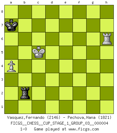 Last move : 1-0 2021 July 18 22:59:26 [Event "FICGS__CHESS__CUP_STAGE_1_GROUP_03__000004"] [Site "FICGS"] [Date "2021.03.02"] [Round "1"] [White "Vasquez,Fernando"] [Black "Pechova,Hana"] [Result "1-0"] [WhiteElo "2146"] [BlackElo "1821"] 1.e4 e5 2.Nf3 Nc6 3.d4 exd4 4.Nxd4 Bc5 5.Nxc6 Qf6 6.Qf3 dxc6 7.Nc3 Be6 8.Be3 Bb4 9.Qxf6 Nxf6 10.f3 O-O-O 11.Kf2 Rhe8 12.a3 Bxc3 13.bxc3 a5 14.Bg5 h6 15.Bxf6 gxf6 16.Bd3 Kd7 17.Rhe1 b6 18.Rad1 Ke7 19.g4 Rh8 20.h4 h5 21.g5 fxg5 22.hxg5 c5 23.f4 c4 24.Be2 Rxd1 25.Rxd1 Bg4 26.Rh1 Bxe2 27.Kxe2 h4 28.Rh3 b5 29.Ke3 Kd6 30.Kf3 Ke6 31.Kf2 c5 32.Kf3 f5 33.Ke3 a4 34.g6 Rh6 35.exf5+ Kxf5 36.g7 Rg6 37.Kf3 Rxg7 38.Rxh4 Ke6 39.Rh6+ Kd5 40.Rh5+ Kd6 41.f5 Rg1 42.Rh6+ Kd7 43.Ke4 Rg3 44.Kd5 Rxc3 45.Kxc5 Rxc2 46.Rh7+ Ke8 47.Kxb5 c3 48.Kxa4 Rf2 49.Kb3 c2 50.Rc7 Rxf5 51.Rxc2 Rf7 52.Rc4 Kd8 53.a4 Rc7 54.Rd4+ Kc8 55.Kb4 Kb8 56.Ka5 Ra7+ 57.Kb5 Rb7+ 58.Ka6 Ra7+ 59.Kb6 Rb7+ 60.Kc6 Rc7+ 61.Kb5 Rb7+ 62.Kc5 Ka7 63.Rd6 Rb1 64.Rf6 Rb3 65.Kc4 Rb2 66.Kc5 Rb1 67.Rh6 Rb3 68.Re6 Rb1 69.Rf6 Rb3 70.Rh6 Rb1 71.Rg6 Rb3 72.Kc4 Rb2 73.Rd6 Rb1 74.Kc5 Rb2 75.Rh6 1-0 This chess game has been lost on time (started : 2021.03.02 1:15:20) Scotch game Queenside Castling by player Black (move 10) 10 pieces endgame at move 45 : White KRPPP , Black KRPPP WHITE : King + 1 Rook 3 Pawns BLACK : King + 1 Rook 3 Pawns 9 pieces endgame at move 45 : White KRPP , Black KRPPP WHITE : King + 1 Rook 2 Pawns BLACK : King + 1 Rook 3 Pawns 8 pieces endgame at move 47 : White KRPP , Black KRPP WHITE : King + 1 Rook 2 Pawns BLACK : King + 1 Rook 2 Pawns 7 pieces endgame at move 48 : White KRPP , Black KRP WHITE : King + 1 Rook 2 Pawns BLACK : King + 1 Rook 1 Pawn 6 pieces endgame at move 50 : White KRP , Black KRP WHITE : King + 1 Rook 1 Pawn BLACK : King + 1 Rook 1 Pawn 5 pieces endgame at move 51 : White KRP , Black KR WHITE : King + 1 Rook 1 Pawn BLACK : King + 1 Rook Player White won this chess game. Follow this game move after move (download)You need not play well - just help your opponent to play badly. (Genrikh Chepukaitis) Smyslow ist ein Beweis dafür, dass ich noch zehn Jahre spielen kann! [der 75 jährige über den 85 jährigen] (Viktor Kortschnoi) Si el ingenio solamente fuese necesario para lucirse, las mujeres serían las mejores jugadoras de Ajedrez del mundo. (Albin) Le profane ne songe pas à la somme de jouissance dont il se prive, qui méconnaît ce jeu aux ressources aussi variées que passionnantes. (Jean-Marie Jeanton-Lamarche) I'll be back. (Arnold Schwarzenegger)