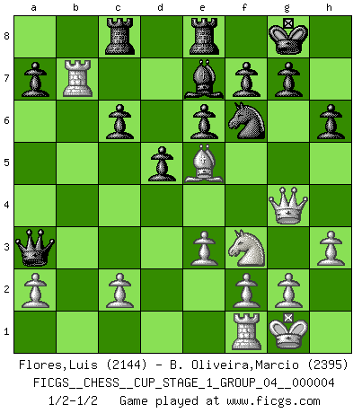 Last move : 1/2-1/2 2021 April 30 2:30:21 [Event "FICGS__CHESS__CUP_STAGE_1_GROUP_04__000004"] [Site "FICGS"] [Date "2021.03.02"] [Round "1"] [White "Flores,Luis"] [Black "B. Oliveira,Marcio"] [Result "1/2-1/2"] [WhiteElo "2144"] [BlackElo "2395"] 1.d4 Nf6 2.Nf3 d5 3.Bf4 c5 4.e3 Nc6 5.Nbd2 Qb6 6.dxc5 Qxb2 7.Rb1 Qc3 8.Bb5 e6 9.O-O Be7 10.Ne5 Bd7 11.Nd3 Rc8 12.Nb3 O-O 13.Bxc6 Bxc6 14.Be5 Qc4 15.Nd4 Qa6 16.Nb4 Qa5 17.Nbxc6 bxc6 18.Rb7 Qxc5 19.Qf3 Qa3 20.Qg3 Rfe8 21.Nf3 h6 22.h3 Nh5 23.Qg4 Nf6 24.Qg3 Nh5 25.Qg4 Nf6 1/2-1/2 Queen's pawn game Kingside Castling by player White (move 9) Kingside Castling by player Black (move 12) This chess game ended in a draw. Follow this game move after move (download)Chess is in its essence a game, in its form an art, and in its execution a science. (Baron Tassilo) Schon mancher Spieler hat aufgegeben, um zu vermeiden, daß er eine Figur verliert. (Savielly Grigorievitsch Tartakower) Tu puedes aprender mucho mas de una partida que pierdas que de una partida ganada. Tendras que perder cientos de partidas antes de llegar a ser un buen jugador. (Jose Raul Capablanca) 'L'échange des dames est un coup dur pour les deux adversaires...' Un journaliste lors d'une partie du match Spassky-Fischer Now you put water in a cup, it becomes the cup; You put water into a bottle it becomes the bottle; You put it in a teapot it becomes the teapot. Water can flow or it can crash. Be water, my friend. (Bruce Lee)