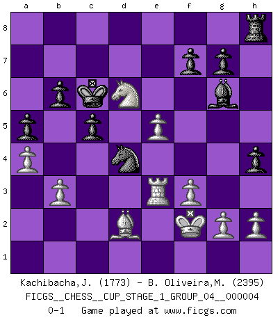 Last move : 0-1 2021 July 3 20:11:27 [Event "FICGS__CHESS__CUP_STAGE_1_GROUP_04__000004"] [Site "FICGS"] [Date "2021.03.02"] [Round "1"] [White "Kachibacha,Jobadi"] [Black "B. Oliveira,Marcio"] [Result "0-1"] [WhiteElo "1773"] [BlackElo "2395"] 1.e4 e5 2.Nf3 Nc6 3.Bb5 Nf6 4.O-O Nxe4 5.d4 Nd6 6.Bxc6 dxc6 7.dxe5 Nf5 8.Qxd8+ Kxd8 9.Nc3 Bd7 10.Rd1 Kc8 11.Ng5 Be8 12.b3 Be7 13.Nge4 b6 14.a4 a5 15.Bb2 Kb7 16.Rd3 Rd8 17.Rad1 Rxd3 18.Rxd3 h5 19.f3 c5 20.Nd5 c4 21.Nxe7 Nxe7 22.Rd8 Rg8 23.Kf2 Nc6 24.Rd2 cxb3 25.cxb3 Kc8 26.Ng3 h4 27.Ne4 Bd7 28.Ng5 Nd8 29.Rc2 Bf5 30.Rc3 Kb7 31.Bc1 Rh8 32.Bf4 c5 33.Bd2 Bg6 34.Re3 Nc6 35.Ne4 Nd4 36.Nd6+ Kc6 0-1 Ruy Lopez : Berlin defense, Open variation Kingside Castling by player White (move 4) Player Black won this chess game. Follow this game move after move (download)By the beauty of his games, the clarity of his play, and the brilliance of his ideas, Fischer made himself an artist of the same stature as Brahms, Rembrandt, and Shakespeare. (David Levy) Das Blackmar-Diemer-Gambit verändert den ganzen Menschen! (Emil Joseph Diemer) Me gusta decir que Bobby Fischer fue el mejor jugador que jamás haya existido. Pero lo que hizo de Fischer un genio, fue su habilidad de mezclar una frescura y pragmatismo Americano con ideas Rusas acerca de la estrategia. (Bruce Pandolfini) Je crois qu'il existe des manières très spécifiques de jouer efficacement contre une machine. Evidemment, nous n'avons aucune chance en technique pure, parce que l'ordinateur calcule de manière parfaite. Mais lorsque nous faisons appel à notre cerveau, en utilisant l'intuition et la compréhension, alors nous restons beaucoup plus forts. (Anatoli Karpov) Drag your thoughts away from your troubles... by the ears, by the heels, or any other way you can manage it. (Mark Twain)