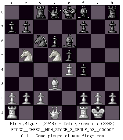 Last move : 0-1 2007 September 12 8:0:50 [Event "FICGS__CHESS__WCH_STAGE_2_GROUP_02__000002"] [Site "FICGS"] [Date "2007.07.11"] [Round "1"] [White "Pires,Miguel"] [Black "Caire,Francois"] [Result "0-1"] [WhiteElo "2248"] [BlackElo "2382"] 1.e4 c5 2.Nf3 Nc6 3.d4 cxd4 4.Nxd4 Nf6 5.Nc3 e5 6.Ndb5 d6 7.Bg5 Be6 8.Nd5 Rc8 9.Bxf6 gxf6 10.Bd3 f5 11.O-O f4 0-1 This chess game has been lost on time (started : 2007.07.11 18:37:4) Sicilian : Pelikan (Lasker/Sveshnikov) variation Kingside Castling by player White (move 11) Player Black won this chess game. Follow this game move after move (download)When you are lonely, when you feel yourself an alien in the world, play Chess. This will raise your spirits and be your counselor in war. (Aristotle) Du musst nicht gut spielen, es reicht, wenn du besser spielst als dein Gegner. (Anonymous) Entre mas años cumplo, mas valoro los Peones. (Keres) Soyez une menace à chaque fois que vous vous asseyez pour jouer. (Ken Smith) Your best chance to get a Royal Flush in a casino is in the bathroom. (Anonymous)