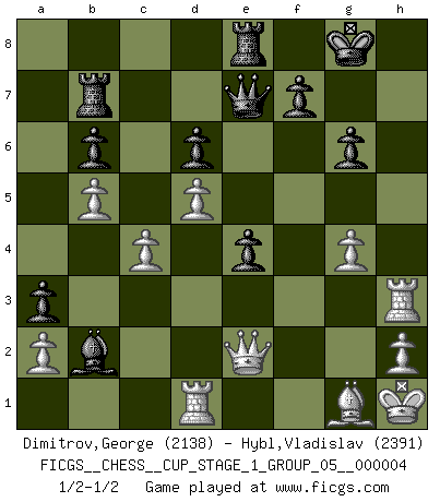 Last move : 1/2-1/2 2021 June 5 7:5:38 [Event "FICGS__CHESS__CUP_STAGE_1_GROUP_05__000004"] [Site "FICGS"] [Date "2021.03.02"] [Round "1"] [White "Dimitrov,George"] [Black "Hybl,Vladislav"] [Result "1/2-1/2"] [WhiteElo "2138"] [BlackElo "2391"] 1.e4 c5 2.Nf3 d6 3.d4 cxd4 4.Nxd4 Nf6 5.Nc3 a6 6.Be3 e5 7.Nb3 Be6 8.f3 h5 9.Qd2 Nbd7 10.Nd5 Bxd5 11.exd5 g6 12.Be2 Bg7 13.O-O b6 14.c4 O-O 15.Rae1 Qc7 16.g4 hxg4 17.fxg4 a5 18.Qd1 Ne4 19.Qc2 Nec5 20.Nxc5 Nxc5 21.Rf3 Qe7 22.Ref1 e4 23.Rh3 a4 24.Qc1 Rfe8 25.Qb1 Ra7 26.Kg2 a3 27.b4 Na4 28.Qc2 Nc3 29.Kh1 Nxe2 30.Qxe2 Rc7 31.Rd1 Rb7 32.Bg1 Bb2 33.b5 1/2-1/2 Sicilian : Najdorf, Byrne (English) attack Kingside Castling by player White (move 13) Kingside Castling by player Black (move 14) This chess game ended in a draw. Follow this game move after move (download)A strong memory, concentration, imagination, and a strong will is required to become a great Chess player. (Bobby Fischer) Frage: Was machen Sie mit den Preisen? Anwort: Ich habe Angst, dass meine Freundin davon neue Kleider kauft. (Loek van Wely) El Ajedrez es despiadado: debes de estar preparado para matar gente. (Nigel Short) Mais n'est-ce pas déjà le limiter injurieusement que d'appeler les échecs un jeu? N'est-ce pas aussi une science, un art, ou quelque chose qui, comme le cercueil de Mahomet entre ciel et terre, est suspendu entre l'un et l'autre, et qui réunit un nombre incroyable de contraires ? (Stefan Zweig) Computers have lots of memory but no imagination. (Anonymous)