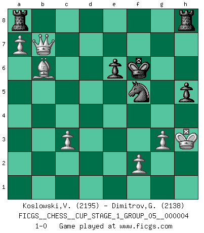 Last move : 1-0 2021 July 5 16:31:40 [Event "FICGS__CHESS__CUP_STAGE_1_GROUP_05__000004"] [Site "FICGS"] [Date "2021.03.02"] [Round "1"] [White "Koslowski,Volker"] [Black "Dimitrov,George"] [Result "1-0"] [WhiteElo "2195"] [BlackElo "2138"] 1.e4 e5 2.Nf3 Nc6 3.Bb5 a6 4.Ba4 Nf6 5.O-O Nxe4 6.d4 b5 7.Bb3 d5 8.dxe5 Be6 9.c3 Be7 10.Be3 O-O 11.Nbd2 Qd7 12.Bc2 Nxd2 13.Qxd2 Bg4 14.Qd3 g6 15.Bh6 Rfe8 16.Rae1 Bf5 17.Qd1 Bxc2 18.Qxc2 Rad8 19.h3 d4 20.e6 fxe6 21.cxd4 Bf6 22.Ne5 Bxe5 23.dxe5 Nb4 24.Qc3 c5 25.Rd1 Qxd1 26.Rxd1 Rxd1+ 27.Kh2 Rc8 28.a4 R1d8 29.h4 Rd3 30.Qe1 Rd4 31.g3 Re8 32.Kg2 Nd3 33.Qe3 Kh8 34.h5 gxh5 35.Bg5 Kg8 36.Bf6 Rd7 37.a5 h4 38.Bxh4 c4 39.Qb6 Kf7 40.Qxa6 Rb8 41.Qc6 Nxe5 42.Qc5 Ng6 43.Bg5 Re8 44.Be3 Rd5 45.Qb6 Rg8 46.a6 Nh4+ 47.Kh3 Nf5 48.Bc5 Kf6 49.a7 c3 50.bxc3 h5 51.Qc6 R5d8 52.Qxb5 Ra8 53.Qb7 Rh8 54.Bb6 1-0 Ruy Lopez : Open, 7.Bb3 Kingside Castling by player White (move 5) Kingside Castling by player Black (move 10) Player White won this chess game. Follow this game move after move (download)Nonsense was the last thing Fischer was interested in, as far as Chess was concerned. (Elie Agur) Fischer machte Schach einfach zu einer aufregenden Sache, wann immer er sich ans Brett setzte. (Raymond Keene) Todos los Maestros de Ajedrez fueron un día unos principiantes. (Chernev) RxDa4 pat (...) A married woman is like a fish riding a bicycle. (Rodolfo d'Ettorre)