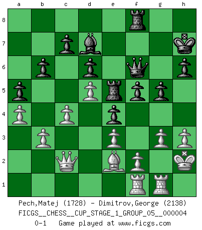 Last move : 0-1 2021 July 13 0:32:17 [Event "FICGS__CHESS__CUP_STAGE_1_GROUP_05__000004"] [Site "FICGS"] [Date "2021.03.02"] [Round "1"] [White "Pech,Matej"] [Black "Dimitrov,George"] [Result "0-1"] [WhiteElo "1728"] [BlackElo "2138"] 1.c4 Nf6 2.Nc3 e5 3.Nf3 Nc6 4.g3 Bb4 5.Bg2 O-O 6.O-O e4 7.Ne1 Bxc3 8.dxc3 h6 9.Nc2 Re8 10.Ne3 d6 11.Qc2 b6 12.b3 a5 13.a4 Bb7 14.Nd5 Nb8 15.Rd1 Nbd7 16.h3 Re5 17.Bf4 Re8 18.Rd2 Nc5 19.Be3 Nxd5 20.cxd5 f5 21.c4 Qe7 22.Bd4 Qg5 23.e3 Nd7 24.Bc3 Ne5 25.Qd1 Bc8 26.Rb1 Bd7 27.Qe2 Re7 28.Ra2 Be8 29.Qc2 Qh5 30.Kh2 Bd7 31.Bxe5 Rxe5 32.Bf1 g5 33.Be2 Qf7 34.Rg1 Kh7 35.R2a1 Rf8 36.Raf1 Qf6 0-1 This chess game has been lost on time (started : 2021.03.02 1:15:25) English Opening Kingside Castling by player Black (move 5) Kingside Castling by player White (move 6) Player Black won this chess game. Follow this game move after move (download)Nowadays, when you're not a grandmaster at 14, you can forget about it. (Anand Viswanathan) Ich verlor meine Bürgerrechte, mein Gehalt wurde mir nicht mehr bezahlt und ich wurde zensiert und durfte nicht mehr ins Ausland reisen. [nach dem Match Fischer-Taimanov 6:0] (Mark Taimanov) Cualquier cambio de material en una posición debe venir por medio de un mate, una captura o promoción de Peón. (Purdy) Les Echecs ont trois composantes : le temps, l'espace et le matériel en dernier. (Mikhail Tal) There are two kinds of people in the world, my friend. Those who have a loaded gun and those who dig. You dig ! (Blondie in The Good, The Bad and The Ugly)