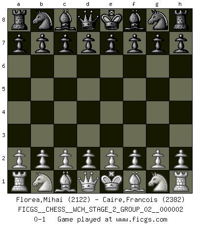 Last move : 0-1 2007 August 10 21:3:22 [Event "FICGS__CHESS__WCH_STAGE_2_GROUP_02__000002"] [Site "FICGS"] [Date "2007.07.11"] [Round "1"] [White "Florea,Mihai"] [Black "Caire,Francois"] [Result "0-1"] [WhiteElo "2122"] [BlackElo "2382"] 0-1 This chess game has been lost on time (started : 2007.07.11 18:37:4) Player Black won this chess game. Follow this game move after move (download)In complicated positions, Bobby Fischer hardly had to be afraid of anybody. (Paul Keres) Schach ist das schnellste Spiel der Welt, weil man in jeder Sekunde Tausende von Gedanken ordnen muß. (Albert Einstein) Solo puedes ser bueno en el Ajedrez si amas al juego. (Bobby Fischer) Horreur, mais aussi harmonie suprême : qu'y avait-il en effet au monde en dehors des échecs ? Le brouillard, l'inconnu, le non-être... (Vladimir Nabokov) Employ the attack like tactic of defense. (Chinese proverb)