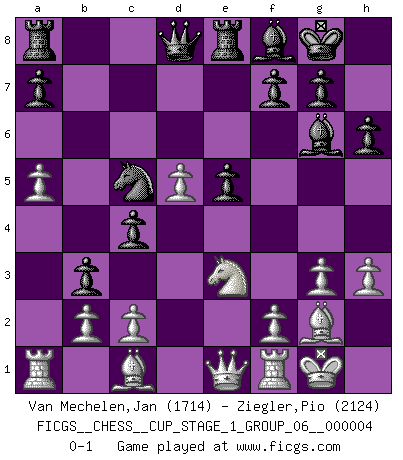 Last move : 0-1 2021 March 18 13:37:2 [Event "FICGS__CHESS__CUP_STAGE_1_GROUP_06__000004"] [Site "FICGS"] [Date "2021.03.02"] [Round "1"] [White "Van Mechelen,Jan"] [Black "Ziegler,Pio"] [Result "0-1"] [WhiteElo "1714"] [BlackElo "2124"] 1.Nf3 Nf6 2.g3 d5 3.Bg2 c6 4.O-O Bg4 5.d3 Nbd7 6.Nbd2 e5 7.e4 dxe4 8.dxe4 Bc5 9.h3 Bh5 10.Qe1 O-O 11.a4 Re8 12.Nb3 Bf8 13.a5 b5 14.Nh4 c5 15.Nf5 c4 16.Nd2 h6 17.Nb1 Nc5 18.Nc3 b4 19.Nd5 Nxd5 20.exd5 Bg6 21.Ne3 b3 0-1 Reti Opening Kingside Castling by player White (move 4) Kingside Castling by player Black (move 10) Player Black won this chess game. Follow this game move after move (download)The combination player thinks forward; he starts from the given position, and tries the forceful moves in his mind. (Emanuel Lasker) Mit sehr nachdenklichem Gesicht schreitet Bobby durch den Turniersaal. Was ist passiert?, fragt Lombardy. Ich stehe schlecht, antwortet Fischer. Lombardy: Dann biete doch einfach Remis an. Fischer: So schlecht stehe ich nun auch wieder nicht! (Robert James Fischer) La táctica fluye a partir de una posición superior. (Bobby Fischer) La vie est comme un jeu d'échecs : nous esquissons un plan, mais celui-ci est tributaire de ce que daignent faire l'adversaire aux échecs et le destin dans la vie. (Arthur Schopenhauer) All battles are fought by scared men who'd rather be someplace else. (John Wayne in the movie In harm's way)