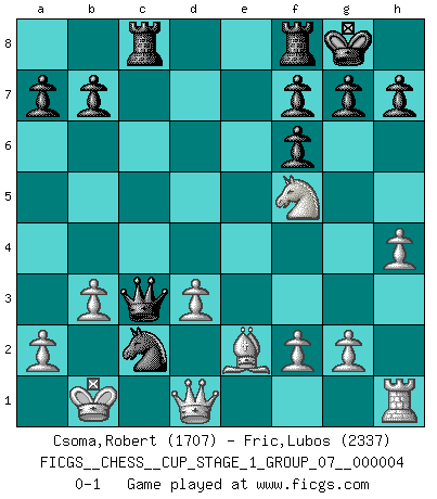 Last move : 0-1 2021 March 23 20:23:9 [Event "FICGS__CHESS__CUP_STAGE_1_GROUP_07__000004"] [Site "FICGS"] [Date "2021.03.02"] [Round "1"] [White "Csoma,Robert"] [Black "Fric,Lubos"] [Result "0-1"] [WhiteElo "1707"] [BlackElo "2337"] 1.d4 Nf6 2.Nc3 d5 3.Nf3 c5 4.dxc5 Nc6 5.Bg5 d4 6.Bxf6 exf6 7.Ne4 Bf5 8.Ng3 Bg6 9.Qd2 Bxc5 10.O-O-O O-O 11.h4 Qd5 12.Kb1 Nb4 13.b3 Bxc2+ 14.Kb2 Bxd1 15.Qxd1 d3 16.exd3 Bd4+ 17.Kb1 Rac8 18.Nxd4 Qxd4 19.Nf5 Qc3 20.Be2 Nc2 0-1 Queen's pawn game Queenside Castling by player White (move 10) Kingside Castling by player Black (move 10) Player Black won this chess game. Follow this game move after move (download)For me, Chess is life and every game is like a new life. Every Chess player gets to live many lives in one lifetime. (Eduard Gufeld) Wer mein Gambit spielt, muß bereit sein, alle Brücken hinter sich abzubrechen. Es verändert den ganzen Menschen. Es wirkt wie ein Zauberstab und fördert verkümmerte, gute Charakter- eigenschaften wieder zu Tage. (Emil Joseph Diemer) Yo siempre he tenido un ligero sentimiento de lástima por una persona que no tiene conocimiento del Ajedrez. (Siegbert Tarrasch) Aux échecs, les retours au sommet sont rares : les dommages psychologiques consécutifs à une défaite sont trop sévères. (Daily Telegraph) Winning isn't everything... but losing is nothing. (Mednis)