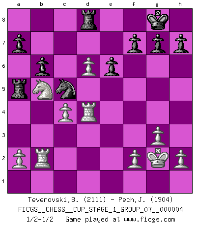 Last move : 1/2-1/2 2021 June 17 21:53:58 [Event "FICGS__CHESS__CUP_STAGE_1_GROUP_07__000004"] [Site "FICGS"] [Date "2021.03.02"] [Round "1"] [White "Teverovski,Bogoljub"] [Black "Pech,Jaroslav"] [Result "1/2-1/2"] [WhiteElo "2111"] [BlackElo "1904"] 1.d4 d5 2.c4 c6 3.Nf3 Nf6 4.e3 Bf5 5.Nc3 e6 6.Nh4 Bg6 7.Be2 Nbd7 8.O-O dxc4 9.Bxc4 Bh5 10.Be2 Bxe2 11.Qxe2 c5 12.Rd1 cxd4 13.exd4 Bb4 14.d5 Qe7 15.Bg5 Bxc3 16.d6 Qd8 17.bxc3 Qa5 18.Nf3 O-O 19.Rab1 b6 20.c4 Qf5 21.Bxf6 Qxf6 22.Nd4 Rfc8 23.g3 Qd8 24.Rb2 Rc5 25.Nb5 Qc8 26.Nc7 Rb8 27.Qe4 Qb7 28.Qxb7 Rxb7 29.Rc2 Ra5 30.Kg2 Rb8 31.Rb2 Rd8 32.Nb5 Nc5 33.Rd4 1/2-1/2 QGD Slav : 4.e3 Bf5 Kingside Castling by player White (move 8) Kingside Castling by player Black (move 18) This chess game ended in a draw. Follow this game move after move (download)I don't believe in psychology. I believe in good moves. (Bobby Fischer) Glücklicherweise sind Großmeister Ruben Fines reine Schachbücher weniger phallozentrisch [als seine Schachpsychologie] und deswegen auch weniger lächerlich. (Nigel Short) Antes de los Finales, los dioses han colocado el Juego Medio. (Siegbert Tarrasch) Le profane ne songe pas à la somme de jouissance dont il se prive, qui méconnaît ce jeu aux ressources aussi variées que passionnantes. (Jean-Marie Jeanton-Lamarche) Any activity becomes creative when the doer cares about doing it right or doing it better. (John Updike)