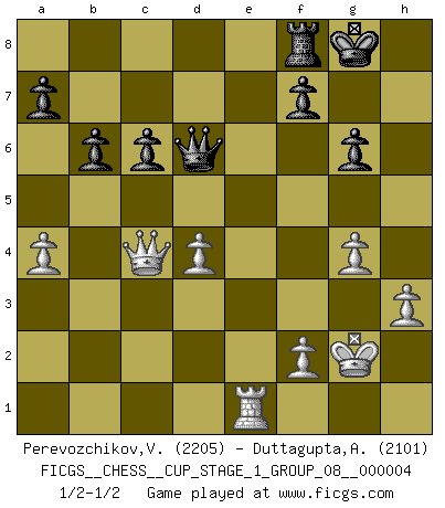 Last move : 1/2-1/2 2021 May 16 3:33:25 [Event "FICGS__CHESS__CUP_STAGE_1_GROUP_08__000004"] [Site "FICGS"] [Date "2021.03.02"] [Round "1"] [White "Perevozchikov,Vjacheslav"] [Black "Duttagupta,Aniruddha"] [Result "1/2-1/2"] [WhiteElo "2205"] [BlackElo "2101"] 1.d4 d5 2.c4 c6 3.Nf3 Nf6 4.Nc3 e6 5.cxd5 exd5 6.Bf4 Bf5 7.e3 Nbd7 8.h3 Qb6 9.Bd3 Qxb2 10.Bxf5 Qxc3+ 11.Kf1 Qa3 12.Qb1 Bb4 13.g4 g6 14.Bxd7+ Nxd7 15.Kg2 Nb6 16.Qc2 Bd6 17.Rab1 Bxf4 18.exf4 O-O 19.Ne5 Qd6 20.Rhe1 Rae8 21.a4 Re7 22.f5 Nc4 23.Nxc4 dxc4 24.fxg6 hxg6 25.Qxc4 Rxe1 26.Rxe1 b6 1/2-1/2 QGD Slav : 4.Nc3 Kingside Castling by player Black (move 18) This chess game ended in a draw. Follow this game move after move (download)I give 98 percent of my mental energy to Chess. Others give only 2 percent. (Bobby Fischer) Sie führen leise Selbstgespräche, schlürfen lautstark ihre Getränke, schmatzen hörbar beim Essen, blasen ihrem Gegenüber Rauch in die Augen, niesen ihm ins Gesicht, starren ihn unverwandt an, bis er sich unter ihren Blicken windet, rutschen ständig auf ihrem Stuhl hin und her, rülpsen und bohren in der Nase. (Anonymous) Entre mas años cumplo, mas valoro los Peones. (Keres) Je ne suis pas le dernier à jouer lâchement des coups douteux pendant le zeïtnot de l'adversaire pour l'achever: en effet les coups qui font le plus peur sont ceux que l'on ne comprend pas. Je me fais souvent peur quand je joue. (Un professeur anonyme) Every now and then a man's mind is stretched by a new idea and never shrinks back to its former dimensions. (Oliver Wendell Holmes, Sr.)