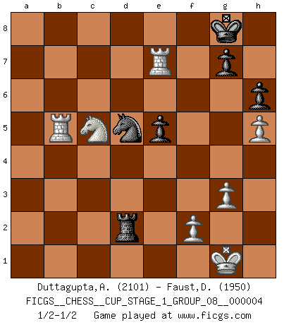 Last move : 1/2-1/2 2021 July 4 8:15:16 [Event "FICGS__CHESS__CUP_STAGE_1_GROUP_08__000004"] [Site "FICGS"] [Date "2021.03.02"] [Round "1"] [White "Duttagupta,Aniruddha"] [Black "Faust,Dieter"] [Result "1/2-1/2"] [WhiteElo "2101"] [BlackElo "1950"] 1.e4 c5 2.d4 cxd4 3.c3 dxc3 4.Nxc3 Nc6 5.Nf3 d6 6.Bc4 a6 7.O-O Nf6 8.Bf4 e6 9.Qe2 Be7 10.Rfd1 Qc7 11.Rac1 O-O 12.Bb3 Qb8 13.Na4 b5 14.Rxc6 bxa4 15.Bxa4 Bd7 16.Rc4 Bb5 17.Bxb5 axb5 18.R4c1 Qb7 19.Bxd6 Bxd6 20.Rxd6 Qxe4 21.Qxe4 Nxe4 22.Rd4 Nf6 23.a3 Nd5 24.g3 b4 25.axb4 Rfb8 26.Ne5 Nxb4 27.Rd7 Nd5 28.Rxf7 Rxb2 29.Ra7 Rf8 30.Nd7 Re8 31.h4 Re2 32.h5 h6 33.Rb1 e5 34.R1b7 Rc2 35.Ra5 Rd2 36.R5a7 Rc2 37.Rb5 Rd2 38.Nc5 Re7 39.Rxe7 1/2-1/2 Sicilian : Smith-Morra gambit Kingside Castling by player White (move 7) Kingside Castling by player Black (move 11) This chess game ended in a draw. Follow this game move after move (download)My style is somewhere between that of Tal and Petrosian. (Reshevsky) Es ist besser die Steine des Gegners zu opfern. (Savielly Grigorievitsch Tartakower) El Ajedrez es un expediente tonto que hace creer a la gente inactiva que hacen una cosa muy astuta cuando solamente estan perdiendo su tiempo. (George Bernard Shaw) Shah mat. Le roi est mort. Cri de fierté d'un joueur venant de terrasser son adversaire, courtoisement, sans effusion de sang. Real knowledge is to know the extent of one's ignorance. (Confucius)