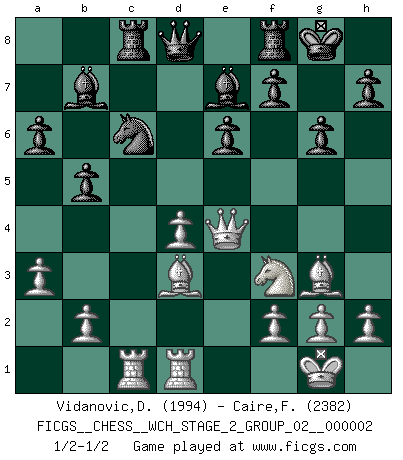 Last move : 1/2-1/2 2007 August 30 22:37:46 [Event "FICGS__CHESS__WCH_STAGE_2_GROUP_02__000002"] [Site "FICGS"] [Date "2007.07.11"] [Round "1"] [White "Vidanovic,Djordje"] [Black "Caire,Francois"] [Result "1/2-1/2"] [WhiteElo "1994"] [BlackElo "2382"] 1.e4 c5 2.c3 d5 3.exd5 Qxd5 4.d4 Nf6 5.Nf3 e6 6.Be2 Nc6 7.O-O cxd4 8.cxd4 Be7 9.Nc3 Qd6 10.Nb5 Qd8 11.Bf4 Nd5 12.Bg3 a6 13.Nc3 O-O 14.Rc1 Nf6 15.a3 b6 16.Qc2 Bb7 17.Rfd1 b5 18.Ne4 Nxe4 19.Qxe4 Rc8 20.Bd3 g6 1/2-1/2 Sicilian : Alapin's variation (2.c3) Kingside Castling by player White (move 7) Kingside Castling by player Black (move 13) This chess game ended in a draw. Follow this game move after move (download)War is the child of passion, passion is the child of narcissism and narcissism is the child. (...) Another game ? (Thibault de Vassal) Obwohl ich alt bin, darf mir niemand den Finger in den Mund stecken, sonst beisse ich. (Wilhelm Steinitz) Nunca antes ha habido un jugador de Ajedrez con tal conocimiento a fondo de las complejidades del juego y una inmensa voluntad absolutamente indomable de ganar. Yo pienso que Fischer es el jugador mas grande que jamás haya existido. (Lisa Lane) Tous ces prétendus hommes politiques sont les pions, les Cavaliers, les Tours ou les Fous d'une partie d'échecs qui se jouera tant qu'un hasard ne renversera pas l'échiquier. (Honoré de Balzac) Two beer, or not two beer. (Unknown)