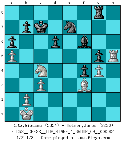 Last move : 1/2-1/2 2021 June 25 19:59:21 [Event "FICGS__CHESS__CUP_STAGE_1_GROUP_09__000004"] [Site "FICGS"] [Date "2021.03.02"] [Round "1"] [White "Rita,Giacomo"] [Black "Helmer,Janos"] [Result "1/2-1/2"] [WhiteElo "2324"] [BlackElo "2220"] 1.e4 c5 2.Nf3 d6 3.d4 cxd4 4.Nxd4 Nf6 5.Nc3 a6 6.Be3 e5 7.Nb3 Be6 8.f3 h5 9.Nd5 Bxd5 10.exd5 Nbd7 11.Qd2 g6 12.O-O-O Nb6 13.Kb1 Nbxd5 14.Bg5 Be7 15.Bd3 Qc7 16.Rhe1 Nb6 17.a4 Nbd7 18.g3 O-O-O 19.Bf1 Kb8 20.Qb4 Qb6 21.Qxb6 Nxb6 22.a5 Nc8 23.Bc4 Nh7 24.Be3 f5 25.c3 h4 26.Bd5 Rde8 27.Bf7 Ref8 28.Be6 hxg3 29.hxg3 Nf6 30.Nd2 Nh5 31.g4 Ng7 32.Bd5 Ne8 33.Rh1 Nf6 34.Be6 f4 35.Bf2 g5 36.Nc4 e4 37.fxe4 Nxe4 38.Bd4 Bf6 39.Bd5 Bxd4 40.Bxe4 Bf6 41.Bf3 Kc7 42.Rh5 Rfg8 43.Rdh1 Rxh5 44.Rxh5 Ne7 1/2-1/2 Sicilian : Najdorf, Byrne (English) attack Queenside Castling by player White (move 12) Queenside Castling by player Black (move 18) This chess game ended in a draw. Follow this game move after move (download)The older I grow, the more I value Pawns. (Keres) Ich brauche nur einen Blick auf das Schachbrett zu werfen, und weiß schon, was in der Stellung steckt, was geschehen kann und was geschehen wird. Alle übrigen suchen und prüfen, ich aber weiß es! (José Raúl Capablanca) ¿Esta Bobby Fischer algo cuerdo?. (Salo Flohr) Le jeu d'échecs est comme rejeté hors du temps. (Antoine de Saint-Exupéry) Nothing is more important for teaching us to understand the concepts we have than constructing fictitious ones. (Ludwig Wittgenstein)