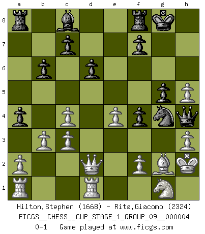 Last move : 0-1 2021 April 7 13:43:30 [Event "FICGS__CHESS__CUP_STAGE_1_GROUP_09__000004"] [Site "FICGS"] [Date "2021.03.02"] [Round "1"] [White "Hilton,Stephen"] [Black "Rita,Giacomo"] [Result "0-1"] [WhiteElo "1668"] [BlackElo "2324"] 1.c4 Nf6 2.Nc3 e5 3.g3 Bb4 4.Bg2 O-O 5.e4 Bxc3 6.dxc3 d6 7.Ne2 Nbd7 8.O-O a5 9.h3 Nc5 10.Qc2 b6 11.g4 a4 12.Be3 Nfd7 13.Rfd1 Ne6 14.Ng3 g6 15.Kh2 h5 16.gxh5 Qh4 17.Qd2 Nf4 18.Bxf4 exf4 19.Ne2 g5 20.Ng1 Ne5 21.b3 Ng4+ 0-1 English Opening Kingside Castling by player Black (move 4) Kingside Castling by player White (move 8) Player Black won this chess game. Follow this game move after move (download)It was clear to me that the vulnerable point of the American Grandmaster (Bobby Fischer) was in double-edged, hanging, irrational positions, where he often failed to find a win even in a won position. (Efim Geller) Fischer ist das größte Genie, das je vom Schachhimmel heruntergestiegen ist. (Mikhail Nekhemyevich Tal) Cuando tengas duda... ¡juega al Ajedrez!. (Tevis) Aux échecs, les retours au sommet sont rares : les dommages psychologiques consécutifs à une défaite sont trop sévères. (Daily Telegraph) The difference between stupidity and genius is that genius has its limits. (Murphy)