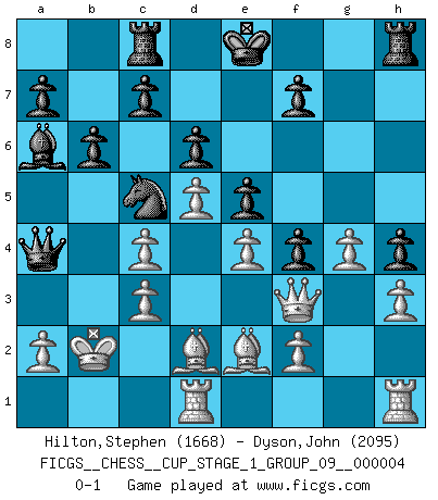 Last move : 0-1 2021 April 9 14:21:43 [Event "FICGS__CHESS__CUP_STAGE_1_GROUP_09__000004"] [Site "FICGS"] [Date "2021.03.02"] [Round "1"] [White "Hilton,Stephen"] [Black "Dyson,John"] [Result "0-1"] [WhiteElo "1668"] [BlackElo "2095"] 1.c4 e5 2.Nc3 Bb4 3.g3 Bxc3 4.bxc3 d6 5.Bg2 Ne7 6.e4 Nbc6 7.Ne2 h5 8.h3 h4 9.g4 g5 10.d4 Ng6 11.d5 Nb8 12.Be3 Nf4 13.Nxf4 gxf4 14.Bd2 Nd7 15.Qe2 b6 16.O-O-O Ba6 17.Bf1 Rc8 18.Qf3 Nc5 19.Be2 Qd7 20.Kb2 Qa4 0-1 English, Kramnik-Shirov counterattack Queenside Castling by player White (move 16) Player Black won this chess game. Follow this game move after move (download)The winner of the game is the player who makes the next-to-last mistake. (Savielly Tartakover) Verschiedene, sehr schätzbare und im Laufe des Lebens nützliche Eigenschaften des Geistes können durch das Schachspiel erworben und gekräftigt werden, so dass sie zu Gewohnheiten werden, die uns nie im Stich lassen. (Benjamin Franklin) El Ajedrez es la vida. (Bobby Fischer) Les Echecs ont trois composantes : le temps, l'espace et le matériel en dernier. (Mikhail Tal) Luck is when opportunity knocks and you answer. (Anonymous)