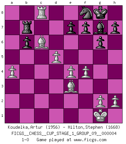 Last move : 1-0 2021 June 24 16:50:9 [Event "FICGS__CHESS__CUP_STAGE_1_GROUP_09__000004"] [Site "FICGS"] [Date "2021.03.02"] [Round "1"] [White "Koudelka,Artur"] [Black "Hilton,Stephen"] [Result "1-0"] [WhiteElo "1956"] [BlackElo "1668"] 1.d4 Nf6 2.c4 g6 3.Nc3 d5 4.cxd5 Nxd5 5.e4 Nxc3 6.bxc3 Bg7 7.Nf3 O-O 8.Be2 c5 9.O-O cxd4 10.cxd4 Nc6 11.Be3 Bg4 12.d5 Bxf3 13.Bxf3 Ne5 14.Be2 Nd7 15.Rc1 b6 16.f4 Rc8 17.Rc6 Nb8 18.Rxc8 Qxc8 19.Qa4 Qb7 20.Rc1 a6 21.Qc2 Nd7 22.Qc7 Rb8 23.Qxb7 Rxb7 24.Rc8+ Nf8 25.Bxa6 Ra7 26.Bc4 Rb7 27.Bb5 Ra7 28.a4 Rb7 29.Bc6 1-0 King's Indian defense, 3.Nc3 Kingside Castling by player Black (move 7) Kingside Castling by player White (move 9) Player White won this chess game. Follow this game move after move (download)There's never before been a Chess player with such a thorough knowledge of the intricacies of the game and such an absolutely indomitable will to win. I think Bobby is the greatest player that ever lived. (Lisa Lane) Dass jemand wie Surab Asmaiparaschwili, der selbst Elopunkte gekauft hat , Vize-Präsident der Fide werden konnte, sagt schon einges über den Zustand dieser Organisation aus. (Joel Lautier) Uno no tiene que jugar muy bien, es suficiente jugar mejor que el oponente. (Siegbert Tarrasch) Un footballeur joue avec ses pieds, parfois avec sa tête. Un joueur d'échecs ne joue qu'avec sa tête. Et quand il ne joue plus, il meurt. (Jacob Murray) The best weapon against an enemy is another enemy. (Friedrich Nietzsche)