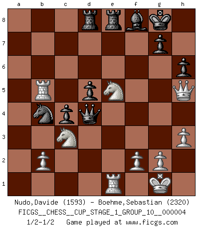 Last move : 1/2-1/2 2021 April 11 13:14:23 [Event "FICGS__CHESS__CUP_STAGE_1_GROUP_10__000004"] [Site "FICGS"] [Date "2021.03.02"] [Round "1"] [White "Nudo,Davide"] [Black "Boehme,Sebastian"] [Result "1/2-1/2"] [WhiteElo "1593"] [BlackElo "2320"] 1.e4 e5 2.Nf3 Nc6 3.Bb5 a6 4.Ba4 Nf6 5.O-O Be7 6.Re1 b5 7.Bb3 O-O 8.h3 Bb7 9.d3 d6 10.a3 Qd7 11.Nc3 Rfe8 12.Bg5 h6 13.Bxf6 Bxf6 14.Nd5 Be7 15.c3 Bf8 16.d4 Rad8 17.a4 exd4 18.axb5 axb5 19.cxd4 Nb8 20.Nc3 c5 21.Bd5 Na6 22.Qe2 Nb4 23.Bxb7 Qxb7 24.Nxb5 d5 25.e5 c4 26.Nc3 f6 27.Ra5 fxe5 28.Nxe5 Qb6 29.Rb5 Qxd4 30.Qh5 1/2-1/2 Davide Nudo Thanks for the game, Mr. Boehme. I never expected to be able to get a draw. Beautiful game ^^ Ruy Lopez : Closed, 7...O-O Kingside Castling by player White (move 5) Kingside Castling by player Black (move 7) This chess game ended in a draw. Follow this game move after move (download)There is no remorse like the remorse of Chess. (H. G. Wells) Wir können eben der zündenden Macht des Opfers nicht wiederstehen, denn die Begeisterung für das Opfer liegt in der Natur des Menschen. (Rudolf Spielmann) La batalla por la última verdad nunca sera ganada. Y es por eso que el Ajedrez es tan fascinante. (Hans Kmoch) Je crois qu'il existe des manières très spécifiques de jouer efficacement contre une machine. Evidemment, nous n'avons aucune chance en technique pure, parce que l'ordinateur calcule de manière parfaite. Mais lorsque nous faisons appel à notre cerveau, en utilisant l'intuition et la compréhension, alors nous restons beaucoup plus forts. (Anatoli Karpov) The best teachers teach from the heart, not from the book. (Author unknown)
