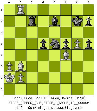 Last move : 1-0 2021 April 22 17:15:32 [Event "FICGS__CHESS__CUP_STAGE_1_GROUP_10__000004"] [Site "FICGS"] [Date "2021.03.02"] [Round "1"] [White "Sorbi,Luca"] [Black "Nudo,Davide"] [Result "1-0"] [WhiteElo "2235"] [BlackElo "1593"] 1.e4 c5 2.Nf3 d6 3.d4 cxd4 4.Nxd4 Nf6 5.Nc3 a6 6.Be3 e5 7.Nb3 Be6 8.f3 Be7 9.Qd2 O-O 10.O-O-O Nbd7 11.g4 b5 12.g5 b4 13.Ne2 Ne8 14.f4 g6 15.h4 a5 16.h5 a4 17.Nbd4 exd4 18.Nxd4 b3 19.Kb1 Qc8 20.cxb3 axb3 21.a3 gxh5 22.f5 Ng7 23.fxe6 fxe6 24.Bb5 Ne5 25.Qe2 Qb7 26.Bc1 Rf7 27.Rh3 Raf8 28.Rxb3 Rf2 29.Qe1 Qa8 30.Nf5 Nxf5 31.Qxf2 Qxe4+ 32.Ka2 Ng7 33.Qh2 Rc8 34.Rb4 Qc2 35.Qxc2 Rxc2 36.Ba4 Rc7 37.Rf1 Nf5 38.Bb3 d5 39.Rb8+ Kg7 40.Rxf5 exf5 41.Bf4 1-0 Sicilian : Najdorf, Byrne (English) attack Kingside Castling by player Black (move 9) Queenside Castling by player White (move 10) Player White won this chess game. Follow this game move after move (download)There just isn't enough televised Chess. (David Letterman) Der 70jährige Viktor Kortschnoi: Die Rentenanstalt wollte mich zwingen in Rente zu gehen. Meine Frau erhält jetzt eine Pension- und ich zahle weiter in die Rentenkasse ein! (Viktor Kortschnoi) Siempre es mucho mejor sacrificar las piezas de tu oponente. (Savielly Tartakover) C'est une question de caractère, Beaucoup de gens perdent leur motivation très vite. D'autres, ils sont rares, peuvent la conserver très longtemps. J'aime les échecs, encore aujourd'hui je suis heureux d'analyser des parties. J'aime toujours gagner, je déteste encore perdre. Bien jouer est important pour mon intégrité intellectuelle et morale. Et puis les échecs vivent en ce moment une période historique grâce à Internet. Ils se développent dans les systèmes éducatifs à travers le monde. Ils sortent de leur ghetto, et c'est mon rôle de mener à bien cette révolution. (Gary Kasparov) The next best thing to gambling and winning is gambling and loosing. (Nick Dandalos)