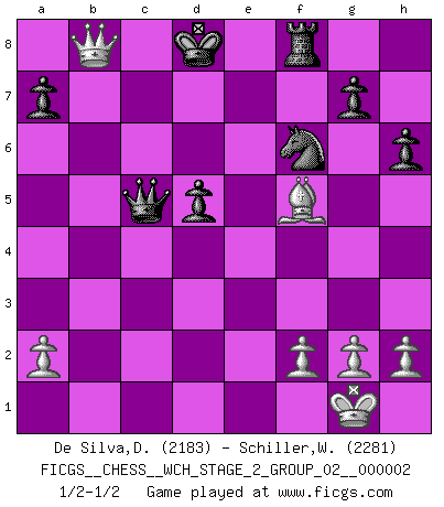 Last move : 1/2-1/2 2007 October 12 9:53:49 [Event "FICGS__CHESS__WCH_STAGE_2_GROUP_02__000002"] [Site "FICGS"] [Date "2007.07.11"] [Round "1"] [White "De Silva,Dinesh"] [Black "Schiller,Wilfried"] [Result "1/2-1/2"] [WhiteElo "2183"] [BlackElo "2281"] 1.e4 c6 2.d4 d5 3.Nc3 dxe4 4.Nxe4 Nd7 5.Ng5 h6 6.Ne6 Qa5+ 7.Bd2 Qb6 8.Bd3 Ngf6 9.Nf3 fxe6 10.Bg6+ Kd8 11.O-O Qxb2 12.c4 Qa3 13.Bf4 b5 14.cxb5 Bb7 15.bxc6 Bxc6 16.Rc1 Rc8 17.d5 exd5 18.Nd4 e5 19.Nxc6+ Rxc6 20.Rxc6 exf4 21.Qb1 Bb4 22.Qf5 Bc5 23.Qxf4 Qa5 24.Rc1 Rf8 25.R6xc5 Nxc5 26.Qb8+ Ke7 27.Qe5+ Kd7 28.Bf5+ Kd8 29.Rxc5 Qxc5 30.Qb8+ Ke7 31.Qe5+ Kd8 32.Qb8+ 1/2-1/2 Caro-Kann : Steinitz variation Kingside Castling by player White (move 11) This chess game ended in a draw. Follow this game move after move (download)Alekhine is a poet who creates a work of art out of something that would hardly inspire another man to send home a picture post card. (Max Euwe) Bobby Fischer ist kein Vorbild für die heutige Jugend. (Viktor Kortschnoi) Una partida de Ajedrez se divide en 3 etapas: la primera cuando piensas que tienes la ventaja, la segunda cuando crees que tienes la ventaja y la tercera... ¡cuando te das cuenta que vas a perder!. (Savielly Tartakower) Les pièces de l'échiquier étaient impitoyables. Elles le retenaient, elles l'absorbaient. Il y avait de l'horreur en cela, mais aussi une harmonie unique. Car, qu'y a-t-il dans le monde, à part les échecs ? (V. Nabokov) When you stop learning you start dying. (Scott Adams)
