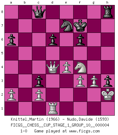 Last move : 1-0 2021 April 22 17:17:16 [Event "FICGS__CHESS__CUP_STAGE_1_GROUP_10__000004"] [Site "FICGS"] [Date "2021.03.02"] [Round "1"] [White "Knittel,Martin"] [Black "Nudo,Davide"] [Result "1-0"] [WhiteElo "1966"] [BlackElo "1593"] 1.e4 c5 2.Nf3 d6 3.d4 cxd4 4.Nxd4 Nf6 5.Nc3 a6 6.Be3 Ng4 7.Bg5 h6 8.Bh4 g5 9.Bg3 Bg7 10.Qd2 Nc6 11.Nb3 Nge5 12.h4 gxh4 13.Bxh4 b5 14.Nd5 Nc4 15.Bxc4 bxc4 16.Nc1 Rb8 17.Rb1 Rxb2 18.Rxb2 Bxb2 19.Ne2 f6 20.O-O c3 21.Qe3 Kf7 22.Ng3 Bg4 23.Re1 Qd7 24.Bxf6 exf6 25.Qf4 Qe6 26.f3 Bh3 27.Qh4 h5 28.Nf4 Qe5 29.Qxh3 h4 30.Nge2 Ne7 31.Qd7 h3 32.Rd1 Ba3 33.g3 Qc5+ 34.Nd4 Qc8 35.Qa4 Bc5 36.Kh2 Bxd4 37.Qxd4 1-0 Sicilian : Najdorf, Byrne (English) attack Kingside Castling by player White (move 20) Player White won this chess game. Follow this game move after move (download)What is the difference between chess and football? Everybody understands football, but nobody plays it. Everybody plays chess, but nobody understands it. Everything is relative. (Vladimir Kramnik) Man wirke der falschen Auffassung entgegen, als ob jeder Zug Unmittelbares zu leisten habe; auch Werte- und Ruhezüge haben ihre Existenzberechtigung. (Aaron Nimzowitsch) La vida es como un juego de Ajedrez, cambiando con cada movimiento. (Proverbio Chino) Aidez vos pièces, elles vous aideront. (Paul Morphy) There are two kinds of people in the world, my friend. Those who have a loaded gun and those who dig. You dig ! (Blondie in The Good, The Bad and The Ugly)