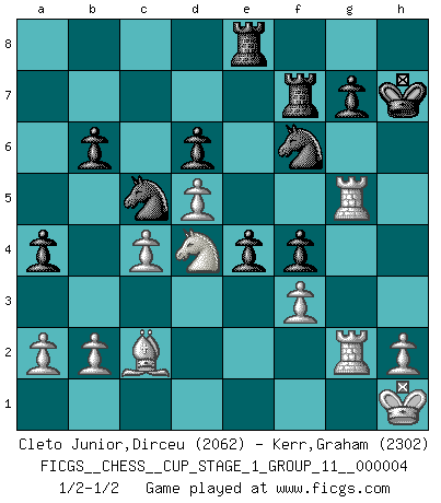 Last move : 1/2-1/2 2021 April 24 5:16:23 [Event "FICGS__CHESS__CUP_STAGE_1_GROUP_11__000004"] [Site "FICGS"] [Date "2021.03.02"] [Round "1"] [White "Cleto Junior,Dirceu"] [Black "Kerr,Graham"] [Result "1/2-1/2"] [WhiteElo "2062"] [BlackElo "2302"] 1.e4 c5 2.Nf3 d6 3.d4 cxd4 4.Nxd4 Nf6 5.Nc3 a6 6.f3 e5 7.Nb3 Be6 8.Be3 h5 9.Be2 Be7 10.Qd2 Nbd7 11.Nd5 Bxd5 12.exd5 Qc7 13.Rc1 O-O 14.c4 b6 15.O-O h4 16.Bg5 h3 17.gxh3 a5 18.Kh1 a4 19.Na1 Nc5 20.Bh6 Nh5 21.Rg1 f5 22.Nc2 f4 23.Rg4 Qd7 24.Rcg1 Rf7 25.Bd1 Kh7 26.Bg5 Bxg5 27.Rxg5 Qxh3 28.Qg2 Qxg2+ 29.R1xg2 Nf6 30.Na3 e4 31.Nb5 Rd8 32.Nd4 Re8 33.Bc2 1/2-1/2 Sicilian : Najdorf Kingside Castling by player Black (move 13) Kingside Castling by player White (move 15) This chess game ended in a draw. Follow this game move after move (download)The passion for playing Chess is one of the most unaccountable in the world. (H.G. Wells) Bis zum Jahr 1971 verlief in meiner Schachkariere alles glatt. Dieses dramatische Match [Fischer-Taimanov 6:0] machte mein Leben zur Hölle. (Mark Taimanov) Hasta este punto, las blancas han seguido un análisis bien conocido. Pero ahora el hace un error fatal: empieza a usar su propia cabeza. (Siegbert Tarrasch) Le thème de l'attaque double intervient d'une manière ou d'une autre dans l'immense majorité des combinaisons. (Youri Averbakh) Creativity is inventing, experimenting, growing, taking risks, breaking rules, making mistakes, and having fun. (Mary Lou Cook)